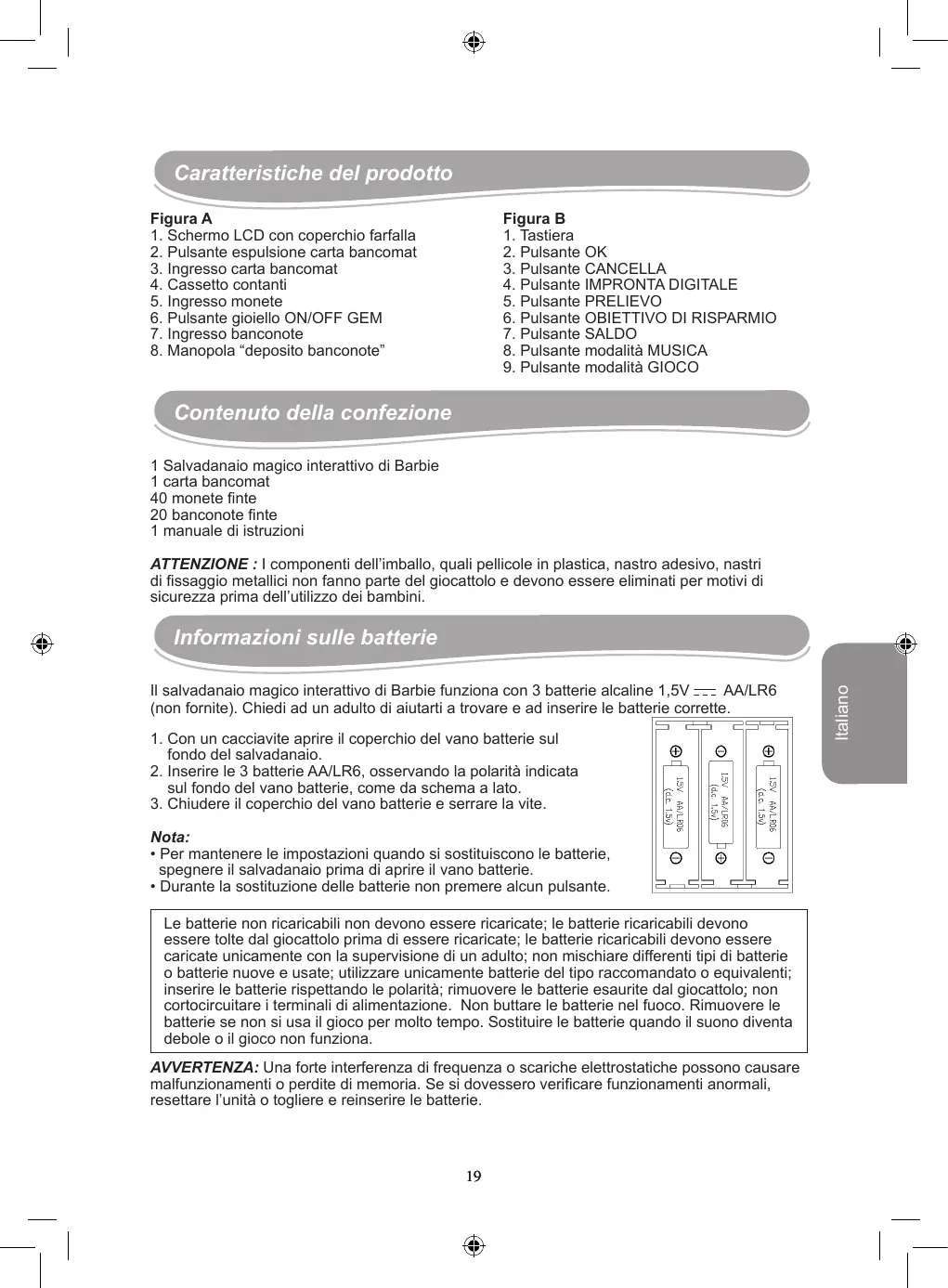 Italiano Informazioni sulle batterie Utilizzare il salvadanaio magico interattivo di Barbie Questa sezione spiega come utilizzare il salvadanaio magico interattivo di Barbie. Leggi le istruzione per scoprire tutte le funzioni. Chiedi ad un adulto di leggere e comprendere le istruzioni di sicurezza. Accendere/ spegnere il salvadanaio magico interattivo di Barbie