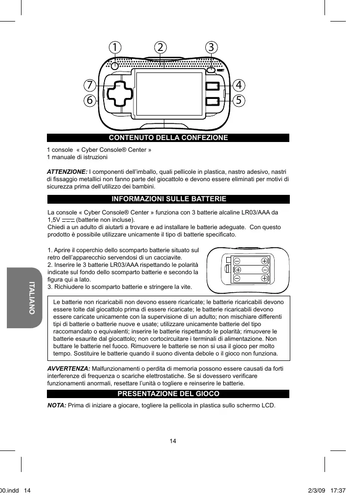 La console « Cyber Console® Center » funzione con 3 batterie alcaline LR03/AAA da 1,5V —— (batterie non incluse).