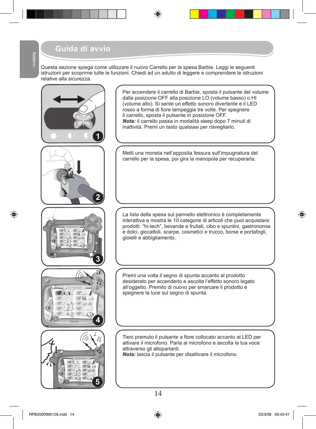 Guida di avvio Questa sezione spiega come utilizzare il nuovo Carrello per la spesa Barbie. Leggi le seguenti istruzioni per scoprirne tutte le funzioni. Chiedi ad un adulto di leggere e comprendere le istruzioni relative alla sicurezza. Per accendere il carrello di Barbie, sposta il pulsante del volume dalla posizione OFF alla posizione LO (volume basso) o HI (volume alto). Si sente un effetto sonoro divertente e il LED rosso a forma di fiore lampeggia tre volte. Per spegnere il carrello, sposta il pulsante in posizione OFF. Nota: il carrello passa in modalità sleep dopo 7 minuti di inattività. Premi un tasto qualsiasi per risvegliarlo.