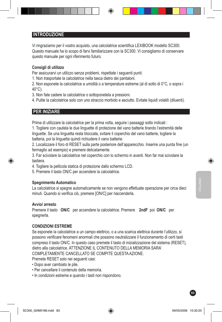 SC300_02IM0186.indd 82 SC300_02IM0156 09/05/2006 10:32:20 INTRODUZIONE Vi ringraziamo per il vostro acquisto, una calcolatrice scientifica LEXIBOOK modello SC300. Questo manuale ha lo scopo di farvi familiarizzare con la SC300. Vi consigliamo di conservare questo manuale per ogni riferimento futuro. Consigli di utilizzo Per assicurarvi un utilizzo senza problemi, rispettate i seguenti punti: