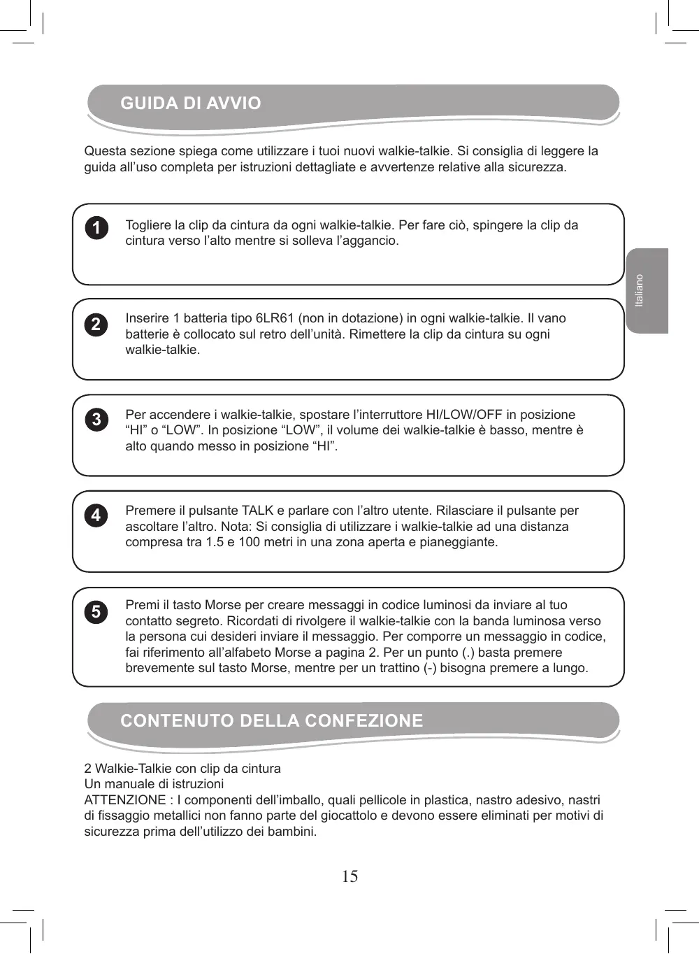 2 Walkie-Talkie con clip da cintura Un manuale di istruzioni ATTENZIONE : I componenti dell’imballo, quali pellicole in plastica, nastro adesivo, nastri di fissaggio metallici non fanno parte del giocattolo e devono essere eliminati per motivi di sicurezza prima dell’utilizzo dei bambini.