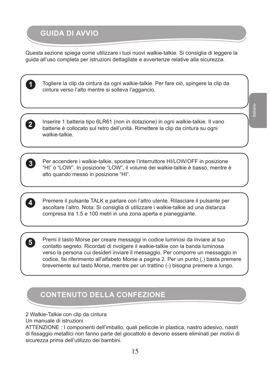 2 Walkie-Talkie con clip da cintura Un manuale di istruzioni ATTENZIONE : I componenti dell’imballo, quali pellicole in plastica, nastro adesivo, nastri di fissaggio metallici non fanno parte del giocattolo e devono essere eliminati per motivi di sicurezza prima dell’utilizzo dei bambini.