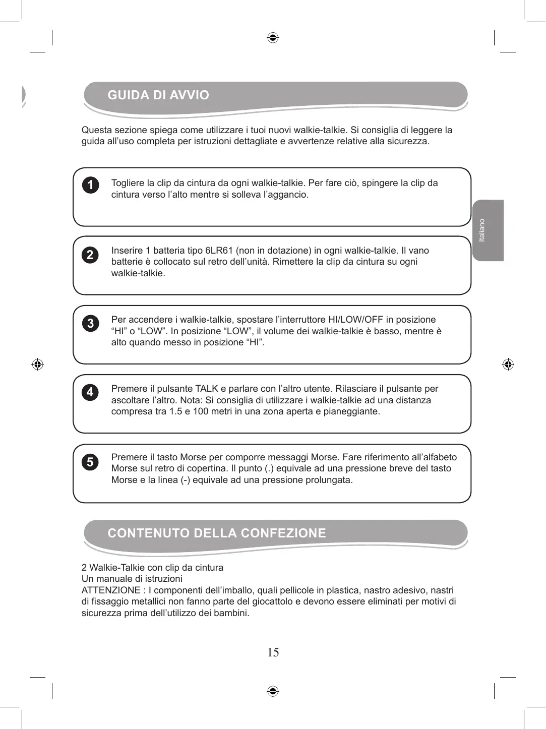 2 Walkie-Talkie con clip da cintura Un manuale di istruzioni ATTENZIONE : I componenti dell’imballo, quali pellicole in plastica, nastro adesivo, nastri di fissaggio metallici non fanno parte del giocattolo e devono essere eliminati per motivi di sicurezza prima dell’utilizzo dei bambini.