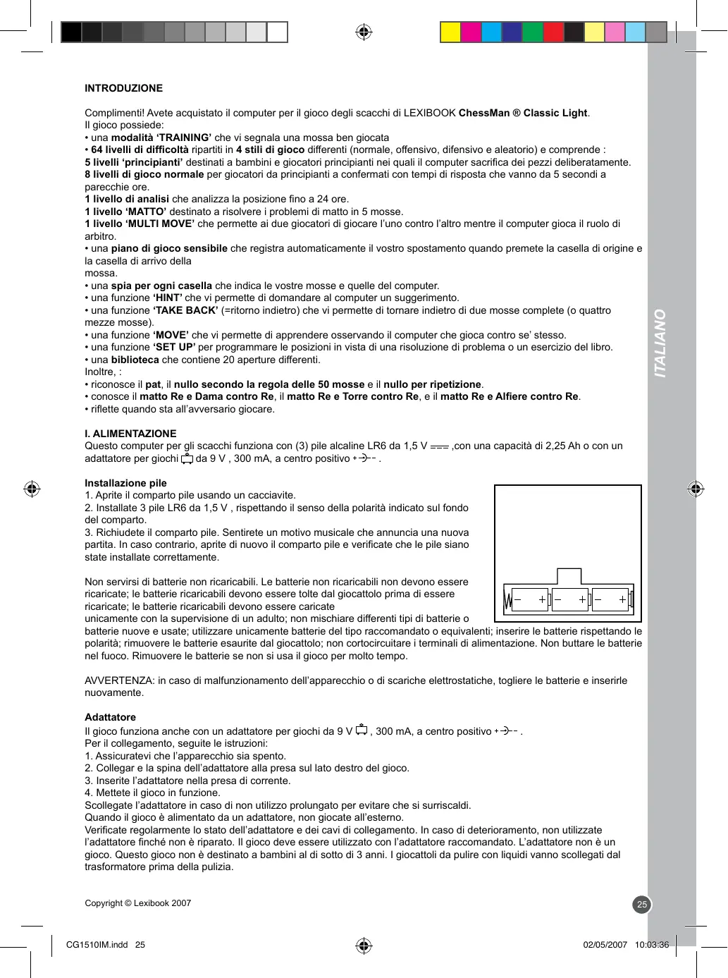 1. Ouvrez le couvercle du compartiment à piles à l’aide d’un tournevis. 2. Installez 3 piles LR6 de 1,5 V en respectant le sens des polarités indiqué au fond du compartiment. 3. Refermez le compartiment à piles. Vous devez alors entendre la petite musique annonçant une nouvelle partie. Dans le cas contraire, ouvrez à nouveau le compartiment à piles et vérifiez que les piles sont correctement installées. Ne pas utiliser de piles rechargeables. Ne pas recharger les piles non rechargeables. Les accumulateurs doivent être enlevés du jouet avant d’être chargés. Les accumulateurs ne doivent être chargés que sous la surveillance d’un adulte. Différents types de piles ou accumulateurs ou des piles ou accumulateurs neufs et usagés ne doivent pas être mélangés. Seuls des piles ou accumulateurs de type recommandé ou d’un type similaire doivent être utilisés. Les piles et accumulateurs doivent être mis en place en respectant la polarité. Les piles et accumulateurs usagés doivent être enlevés du jouet. Les bornes d’une pile ou d’un accumulateur ne doivent pas être mises en court-circuit. Ne pas jeter les piles au feu. Retirer les piles en cas de non utilisation prolongée. ATTENTION : si le produit présente un mauvais fonctionnement ou subit des décharges électrostatiques, enlevez puis remettez les piles. Adaptateur Le jeu fonctionne aussi avec un adaptateur pour jouets de 9 V , 300 mA, à centre positif . Pour le branchement, suivez ces instructions : 1. Assurez-vous que l’appareil est éteint. 2. Branchez la fiche de l’adaptateur dans la prise située sur le côté droit du jeu. 3. Branchez l’adaptateur dans une prise de courant. 4. Mettez le jeu en marche. Débranchez l’adaptateur en cas de non-utilisation prolongée afin d’éviter tout échauffement. Lorsque le jeu est alimenté par un adaptateur, ne jouez pas à l’extérieur. Vérifiez régulièrement l’état de l’adaptateur et des fils de branchement. En cas de détérioration, n’utilisez pas l’adaptateur jusqu’à réparation. Le jeu ne doit être utilisé qu’avec l’adaptateur recommandé. Copyright © Lexibook 2007