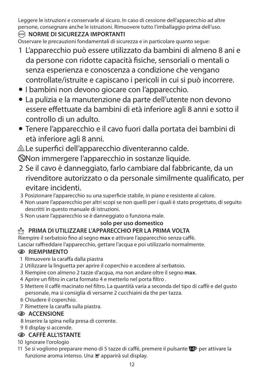 - Tenere l’apparecchio e il cavo fuori dalla portata dei bambini di età inferiore agli 8 anni. h Le superfici dell’apparecchio diventeranno calde. lNon immergere l’apparecchio in sostanze liquide. 2 Se il cavo è danneggiato, farlo cambiare dal fabbricante, da un rivenditore autorizzato o da personale similmente qualificato, per evitare incidenti. 3 Posizionare l’apparecchio su una superficie stabile, in piano e resistente al calore. 4 Non usare l’apparecchio per altri scopi se non quelli per i quali è stato progettato, di seguito descritti in questo manuale di istruzioni. 5 Non usare l’apparecchio se è danneggiato o funziona male. solo per uso domestico U PRIMA DI UTILIZZARE L’APPARECCHIO PER LA PRIMA VOLTA Riempire il serbatoio fino al segno max e attivare l’apparecchio senza caffè. Lasciar raffreddare l’apparecchio, gettare l’acqua e poi utilizzarlo normalmente. C RIEMPIMENTO 1 Rimuovere la caraffa dalla piastra 2 Utilizzare la linguetta per aprire il coperchio e accedere al serbatoio. 3 Riempire con almeno 2 tazze d’acqua, ma non andare oltre il segno max. 4 Aprire un filtro in carta formato 4 e metterlo nel porta filtro . 5 Mettere il caffè macinato nel filtro. La quantità varia a seconda del tipo di caffè e del gusto personale, ma si consiglia di versarne 2 cucchiaini da the per tazza. 6 Chiudere il coperchio. 7 Rimettere la caraffa sulla piastra. C ACCENSIONE 8 Inserire la spina nella presa di corrente. 9 Il display si accende.