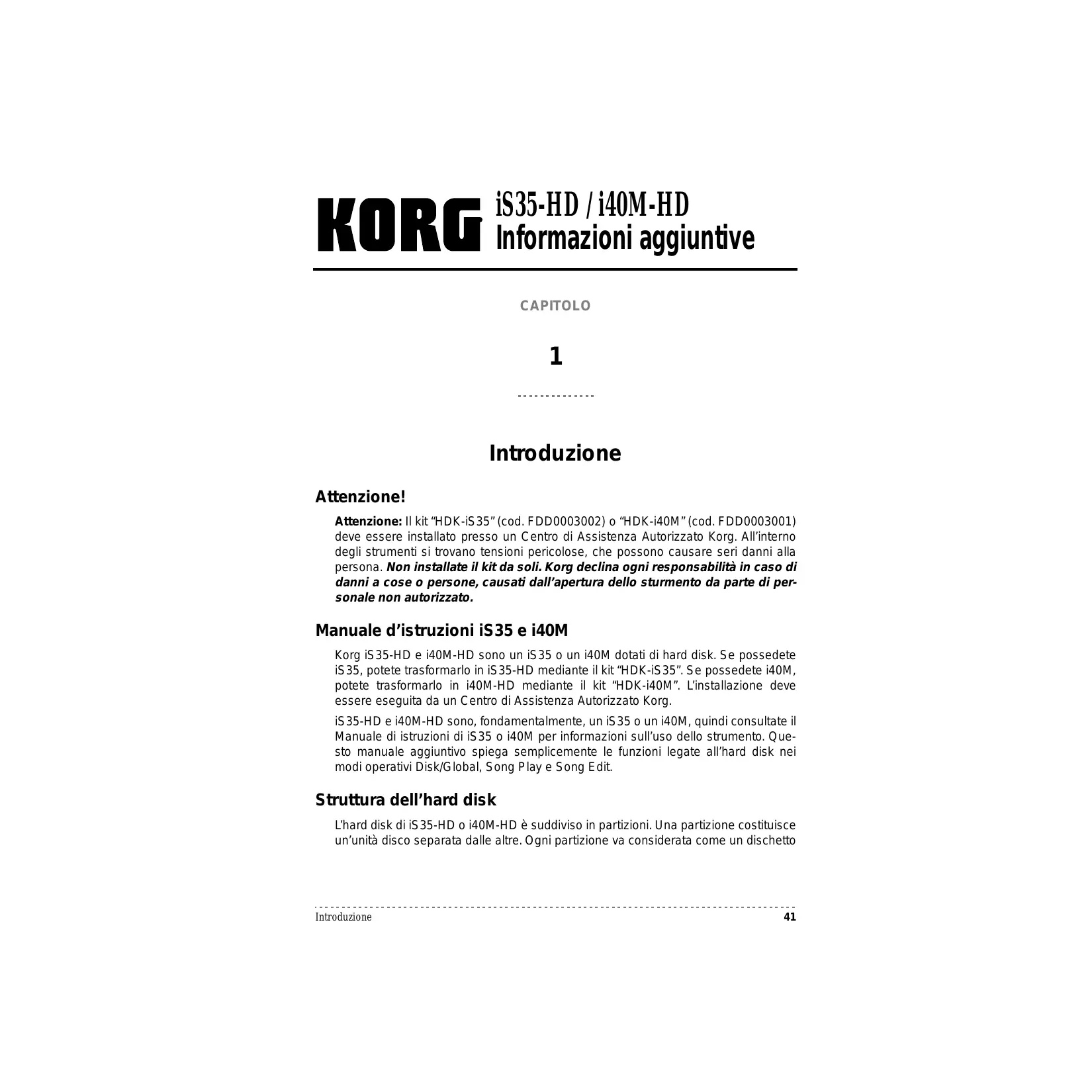 Mode d’emploi iS35 et i40M Korg iS35-HD et i40M-HD sont un iS35 ou un i40M dotés de disque dur. Si vous possédez un iS35, vous pouvez le transformer en iS35-HD en installant le kit “HDKiS35”. Si vous possédez un i40M, vous pouvez le transformer en i40M-HD en installant le kit “HDK-i40M”. L’installation doit être effectuée par un Centre d’Assistance