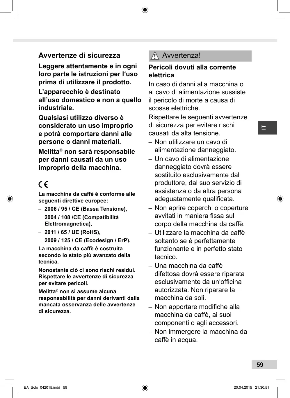 Leggere attentamente e in ogni loro parte le istruzioni per l‘uso prima di utilizzare il prodotto. L’apparecchio è destinato all’uso domestico e non a quello industriale. Qualsiasi utilizzo diverso è considerato un uso improprio e potrà comportare danni alle persone o danni materiali. Melitta® non sarà responsabile per danni causati da un uso improprio della macchina. La macchina da caffè è conforme alle seguenti direttive europee: – 2006 / 95 / CE (Bassa Tensione), – 2004 / 108 /CE (Compatibilità Elettromagnetica), – 2011 / 65 / UE (RoHS), – 2009 / 125 / CE (Ecodesign / ErP). La macchina da caffè è costruita secondo lo stato più avanzato della tecnica. Nonostante ciò ci sono rischi residui. Rispettare le avvertenze di sicurezza per evitare pericoli. Melitta® non si assume alcuna responsabilità per danni derivanti dalla mancata osservanza delle avvertenze di sicurezza. Avvertenza! Pericoli dovuti alla corrente elettrica In caso di danni alla macchina o al cavo di alimentazione sussiste il pericolo di morte a causa di scosse elettriche. Rispettare le seguenti avvertenze di sicurezza per evitare rischi causati da alta tensione. – Non utilizzare un cavo di alimentazione danneggiato. – Un cavo di alimentazione danneggiato dovrà essere sostituito esclusivamente dal produttore, dal suo servizio di assistenza o da altra persona adeguatamente qualificata. – Non aprire coperchi o coperture avvitati in maniera fissa sul corpo della macchina da caffè. – Utilizzare la macchina da caffè soltanto se è perfettamente funzionante e in perfetto stato tecnico. – Una macchina da caffè difettosa dovrà essere riparata esclusivamente da un‘officina autorizzata. Non riparare la macchina da soli. – Non apportare modifiche alla macchina da caffè, ai suoi componenti o agli accessori. – Non immergere la macchina da caffè in acqua.