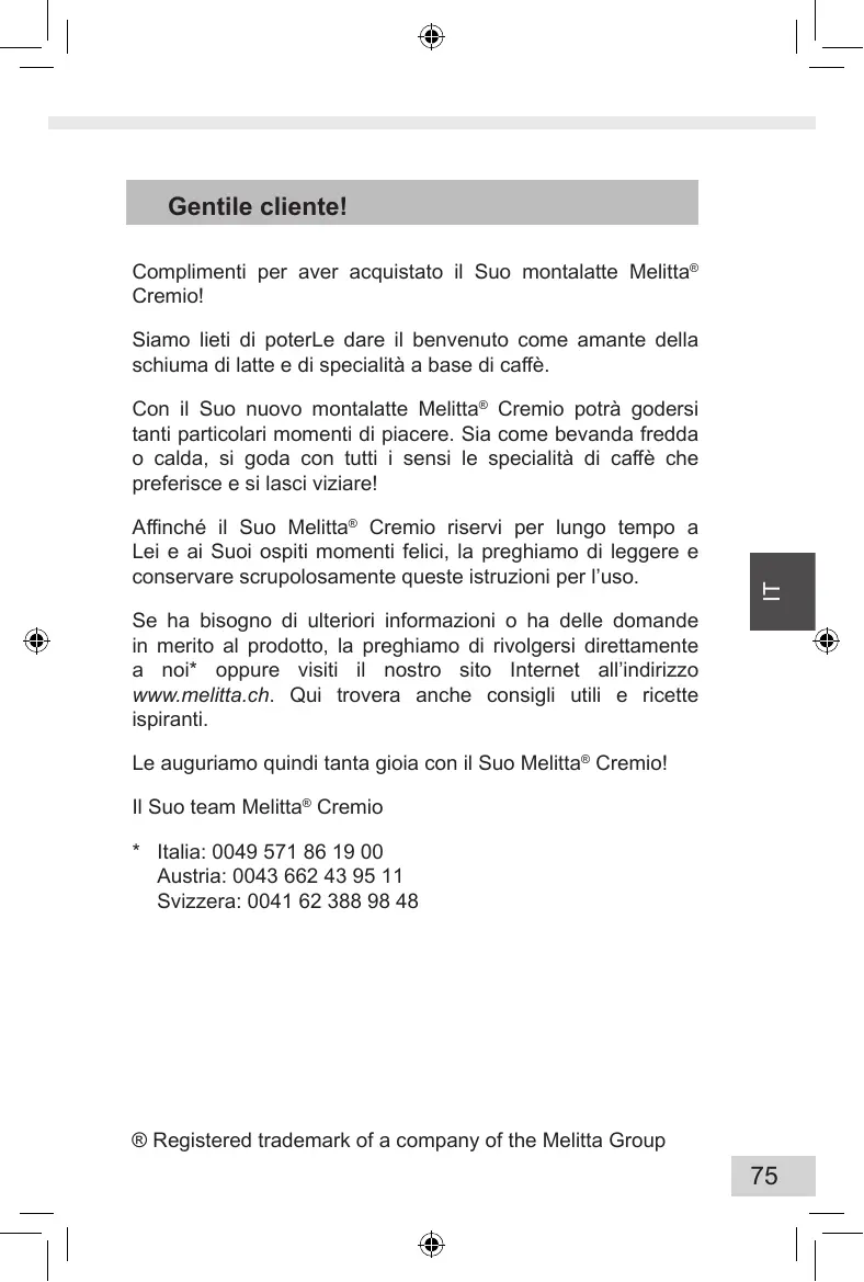 Se ha bisogno di ulteriori informazioni o ha delle domande in merito al prodotto, la preghiamo di rivolgersi direttamente a noi* oppure visiti il nostro sito Internet all’indirizzo www.melitta.ch. Qui trovera anche consigli utili e ricette ispiranti. Le auguriamo quindi tanta gioia con il Suo Melitta® Cremio! Il Suo team Melitta® Cremio * Italia: 0049 571 86 19 00 Austria: 0043 662 43 95 11 Svizzera: 0041 62 388 98 48