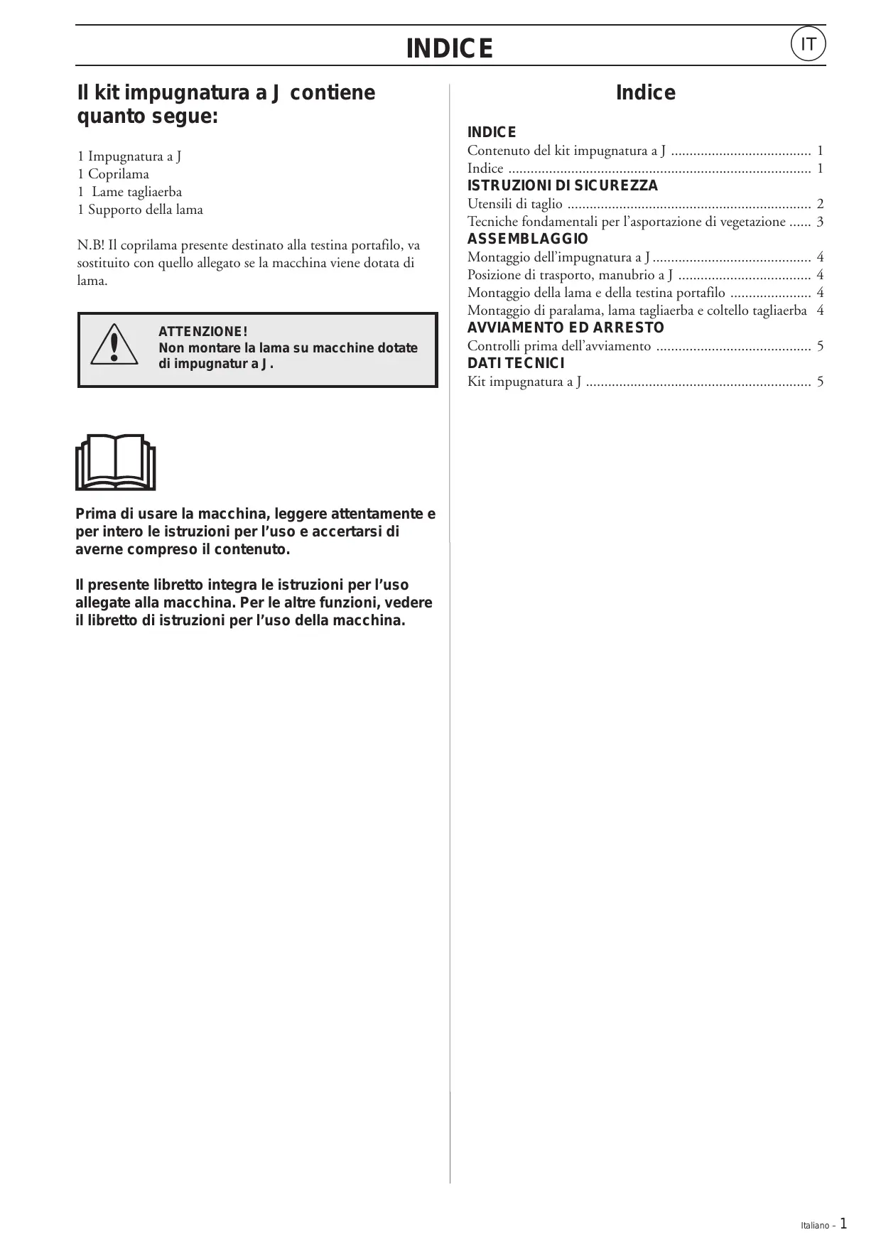 Indice INDICE Contenuto del kit impugnatura a J Indice ISTRUZIONI DI SICUREZZA Utensili di taglio Tecniche fondamentali per l’asportazione di vegetazione ASSEMBLAGGIO Montaggio dell’impugnatura a J Posizione di trasporto, manubrio a J Montaggio della lama e della testina portafilo Montaggio di paralama, lama tagliaerba e coltello tagliaerba AVVIAMENTO ED ARRESTO Controlli prima dell’avviamento DATI TECNICI Kit impugnatura a J
