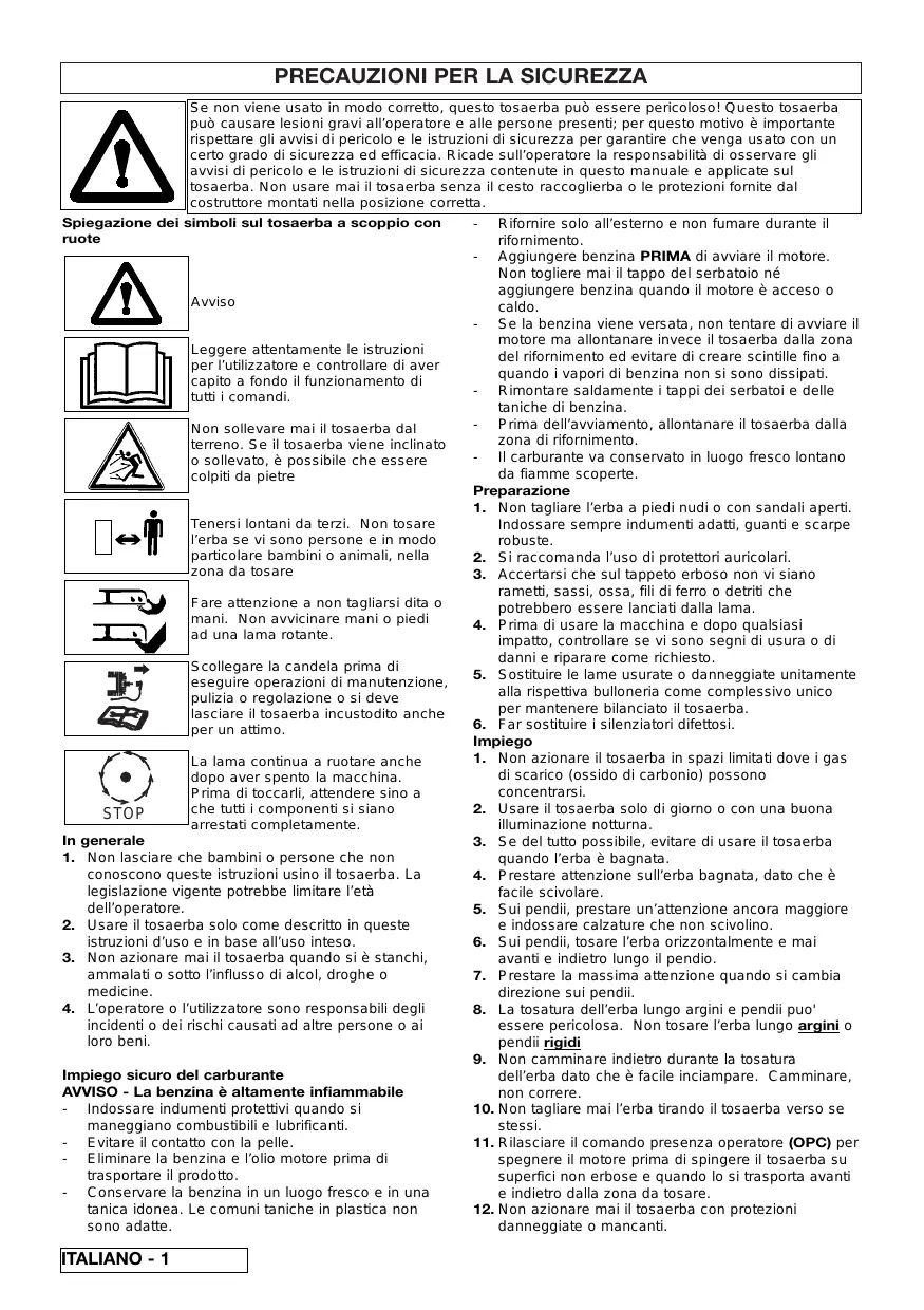 Se non viene usato in modo corretto, questo tosaerba può essere pericoloso! Questo tosaerba può causare lesioni gravi all’operatore e alle persone presenti; per questo motivo è importante rispettare gli avvisi di pericolo e le istruzioni di sicurezza per garantire che venga usato con un certo grado di sicurezza ed efficacia. Ricade sull’operatore la responsabilità di osservare gli avvisi di pericolo e le istruzioni di sicurezza contenute in questo manuale e applicate sul tosaerba. Non usare mai il tosaerba senza il cesto raccoglierba o le protezioni fornite dal costruttore montati nella posizione corretta. Spiegazione dei simboli sul tosaerba a scoppio con ruote Avviso Leggere attentamente le istruzioni per l’utilizzatore e controllare di aver capito a fondo il funzionamento di tutti i comandi. Non sollevare mai il tosaerba dal terreno. Se il tosaerba viene inclinato o sollevato, è possibile che essere colpiti da pietre Tenersi lontani da terzi. Non tosare l’erba se vi sono persone e in modo particolare bambini o animali, nella zona da tosare Fare attenzione a non tagliarsi dita o mani. Non avvicinare mani o piedi ad una lama rotante. Scollegare la candela prima di eseguire operazioni di manutenzione, pulizia o regolazione o si deve lasciare il tosaerba incustodito anche per un attimo. STOP La lama continua a ruotare anche dopo aver spento la macchina. Prima di toccarli, attendere sino a che tutti i componenti si siano arrestati completamente. In generale