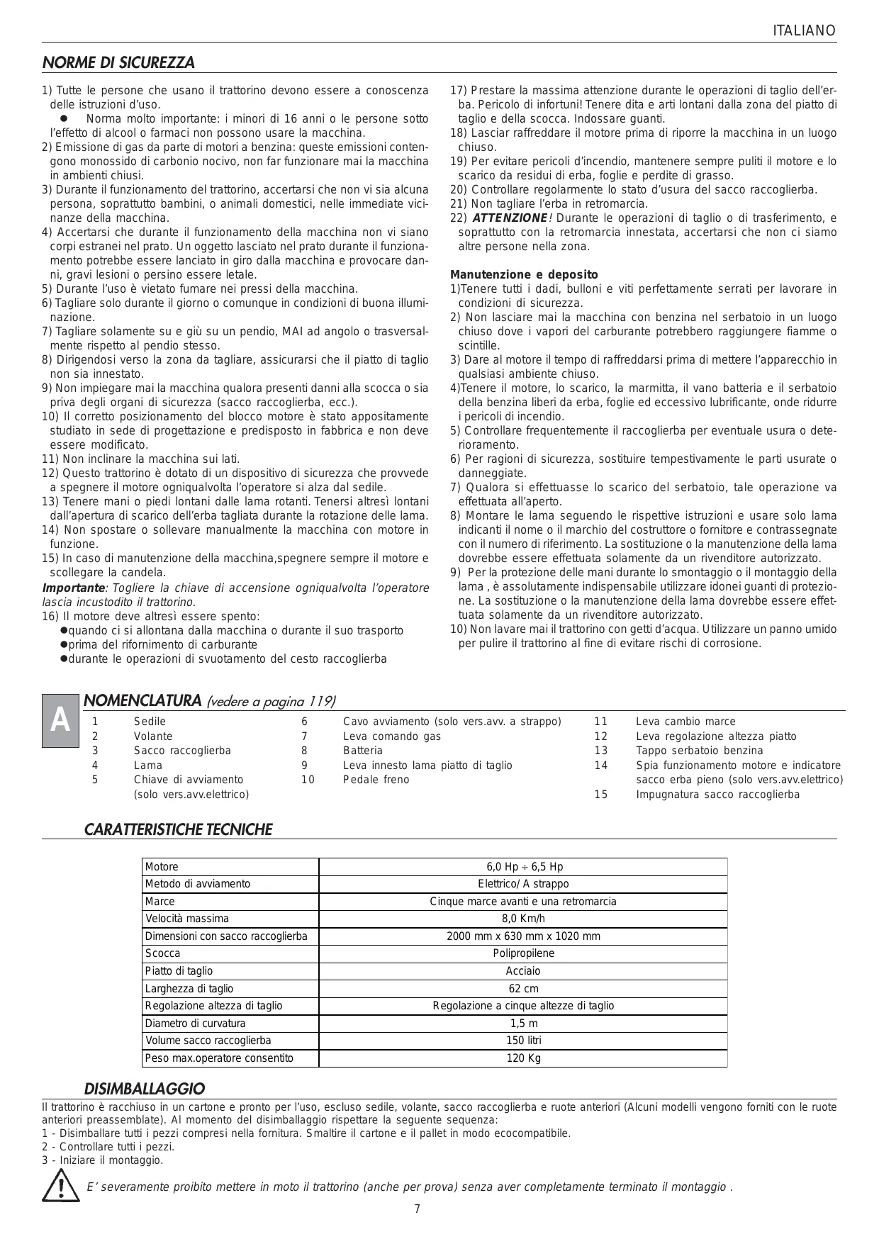 - Pas op! De gebruiksaanwijzing voor het gebruik nauwkeurig doorlezen. 3) Pendant le fonctionnement de la machine, veuillez vous assurer qu’aucune personne, surtout enfants ou animaux domestiques ne se trouvent à proximité de la machine. 4)Veuillez vous assurer que pendant le fonctionnement de la machine aucun corps étranger ne se trouve dans le gazon. Un objet laissé dans le gazon pendant le fonctionnement pourrait être lancé tout autour par la machine et causer des dommages, lésions graves ou même être mortel. 5) Pendant l’emploi il est interdit de fumer à proximité de la machine. 6) Tondre uniquement à la lumière du jour ou de toute façon en conditions de bon éclairage. 7)Tondre uniquement en haut et en bas sur une pente, JAMAIS à angle ou transversalement par rapport à la pente même. 8)En se rapprochant de la zone à tondre, vérifier que le plat de coupe n’est pas enclenché. 9) N’utiliser jamais la machine si le carter est endommagé ou en absence des dispositifs de sécurité (sac de ramassage, etc.). 10) Le positionnement correct du bloc moteur a été expressément projeté et prédisposé en usine et ne doit pas être modifié. 11)Ne pas incliner la machine sur les côtés. 12) Cette machine est munie d’un dispositif de sécurité qui arrête le moteur chaque fois que l’opérateur se lève du siège. 13) Tenir les mains et les pieds loin des lames en rotation. Se tenir aussi loin de l’ouverture de déchargement de l’herbe coupée pendant la rotation des lames. 14)Ne pas déplacer ou soulever à la main la machine avec moteur en fonction. 15)En cas d’entretien de la machine, arrêter toujours le moteur et débrancher la bougie. Important : Enlever la clé de contact chaque fois que l’opérateur laisse la tondeuse non gardée. 16)Le moteur doit également être arrêté dans les cas suivants: l vous vous éloignez de la machine ou pendant son transport l avant le remplissage de carburant l pendant les opérations de vidage du sac de ramassage.