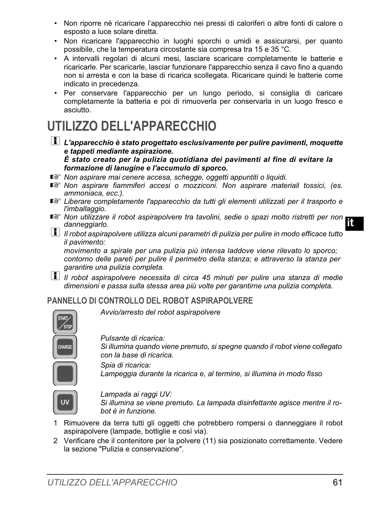 Avvio/arresto del robot aspirapolvere Pulsante di ricarica: Si illumina quando viene premuto, si spegne quando il robot viene collegato con la base di ricarica. Spia di ricarica: Lampeggia durante la ricarica e, al termine, si illumina in modo fisso Lampada ai raggi UV: Si illumina se viene premuto. La lampada disinfettante agisce mentre il robot è in funzione. 1 Rimuovere da terra tutti gli oggetti che potrebbero rompersi o danneggiare il robot aspirapolvere (lampade, bottiglie e così via). 2 Verificare che il contenitore per la polvere (11) sia posizionato correttamente. Vedere la sezione "Pulizia e conservazione". UTILIZZO DELL'APPARECCHIO