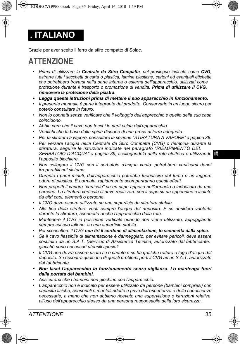 BOOKCVG9900.book Page 35 Friday, April 16, 2010 1:59 PM . ITALIANO Grazie per aver scelto il ferro da stiro compatto di Solac. ATTENZIONE