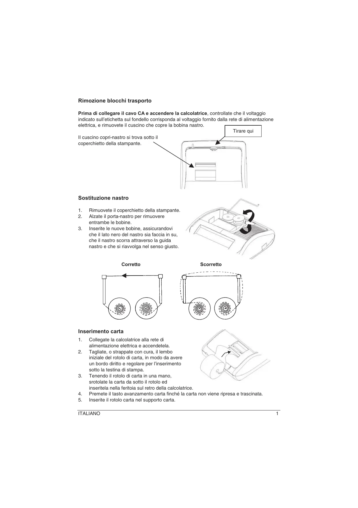 Collegate la calcolatrice alla rete di alimentazione elettrica e accendetela. Tagliate, o strappate con cura, il lembo iniziale del rotolo di carta, in modo da avere un bordo diritto e regolare per l’inserimento sotto la testina di stampa. Tenendo il rotolo di carta in una mano, srotolate la carta da sotto il rotolo ed inseritela nella feritoia sul retro della calcolatrice. Premete il tasto avanzamento carta finché la carta non viene ripresa e trascinata. Inserite il rotolo carta nel supporto carta. ITALIANO