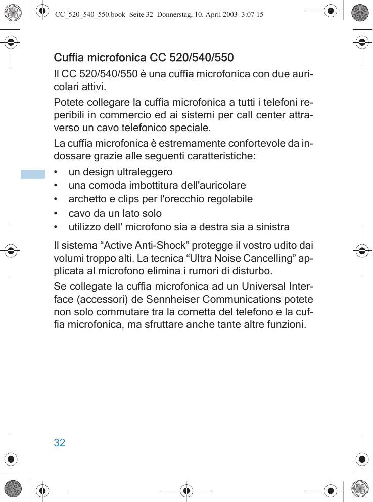 Scarica le istruzioni per il tuo Cuffia di comunicazione in formato PDF gratuitamente! Trova il tuo manuale CC 550 - SENNHEISER e riprendi in mano il tuo dispositivo elettronico. In questa pagina sono pubblicati tutti i documenti necessari per l'utilizzo del tuo dispositivo. CC 550 del marchio SENNHEISER.