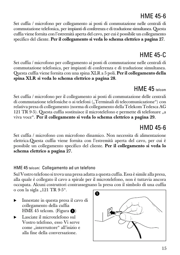 Set cuffia / microfono per il collegamento ai posti di commutazione delle centrali di commutatione Telefoniche o ai Telefoni („Terminali di telecomunicazione“) con relativa presa di collegamento (norma di collegamento della Telekom Tedesca AG 121 TR 9-5). Questa cuffia sostituisce il microtelefon e permette di Telefonare „a viva voce". Per il collegamento si vedo lo schema elettrico a pagna 29.