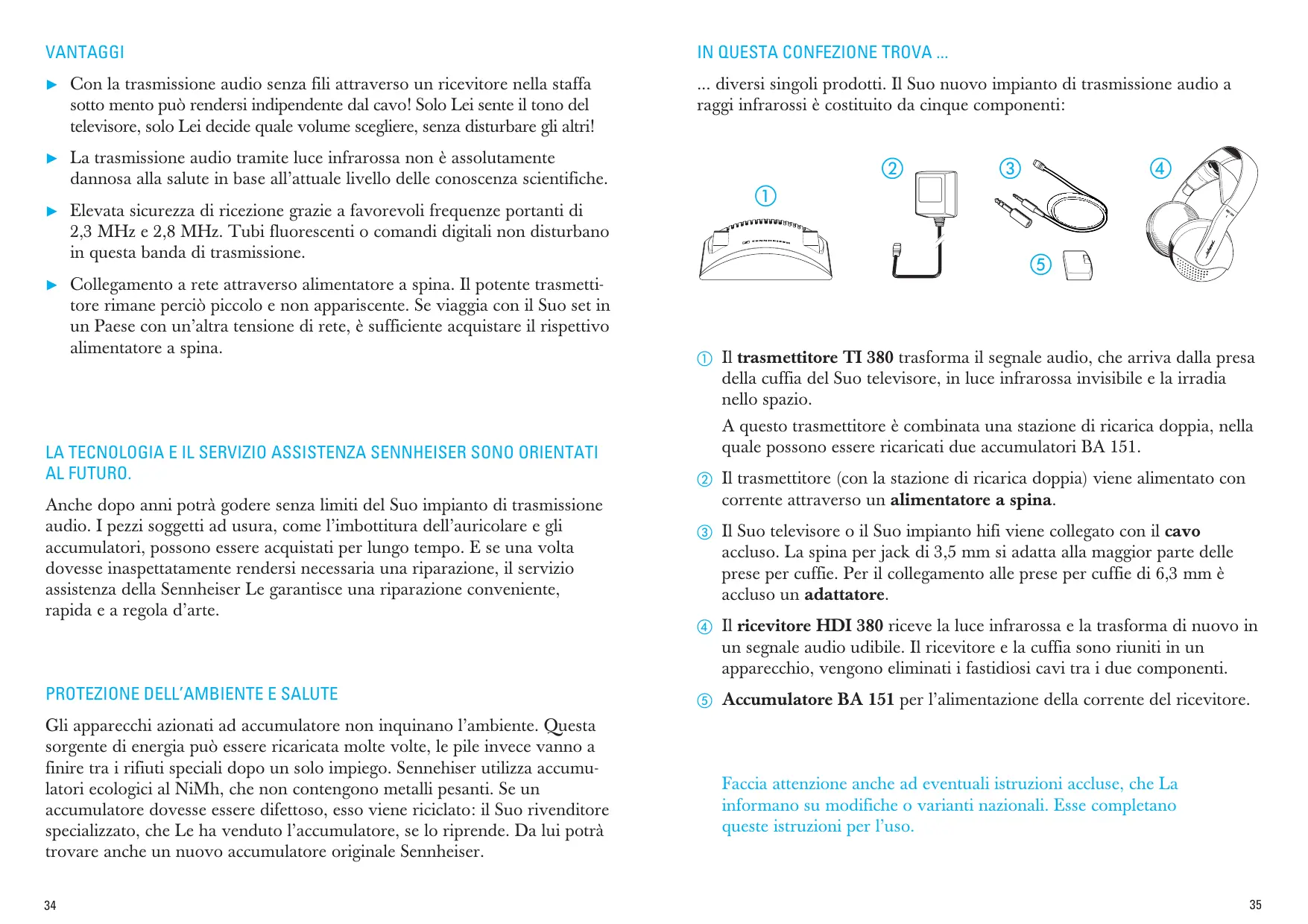 Il set stereo a raggi infrarossi IS 380 forma con il suo trasmettitore TI 380 e il suo ricevitore HDI 380 un canale di trasmissione del tono alla fili con una elevata qualità del tono. Essa è adatta al collegamento a tutti i normali apparecchi hifi e tevisivi, e permetteosi un ascolto indisturbato alla disturbare及其他 persona.