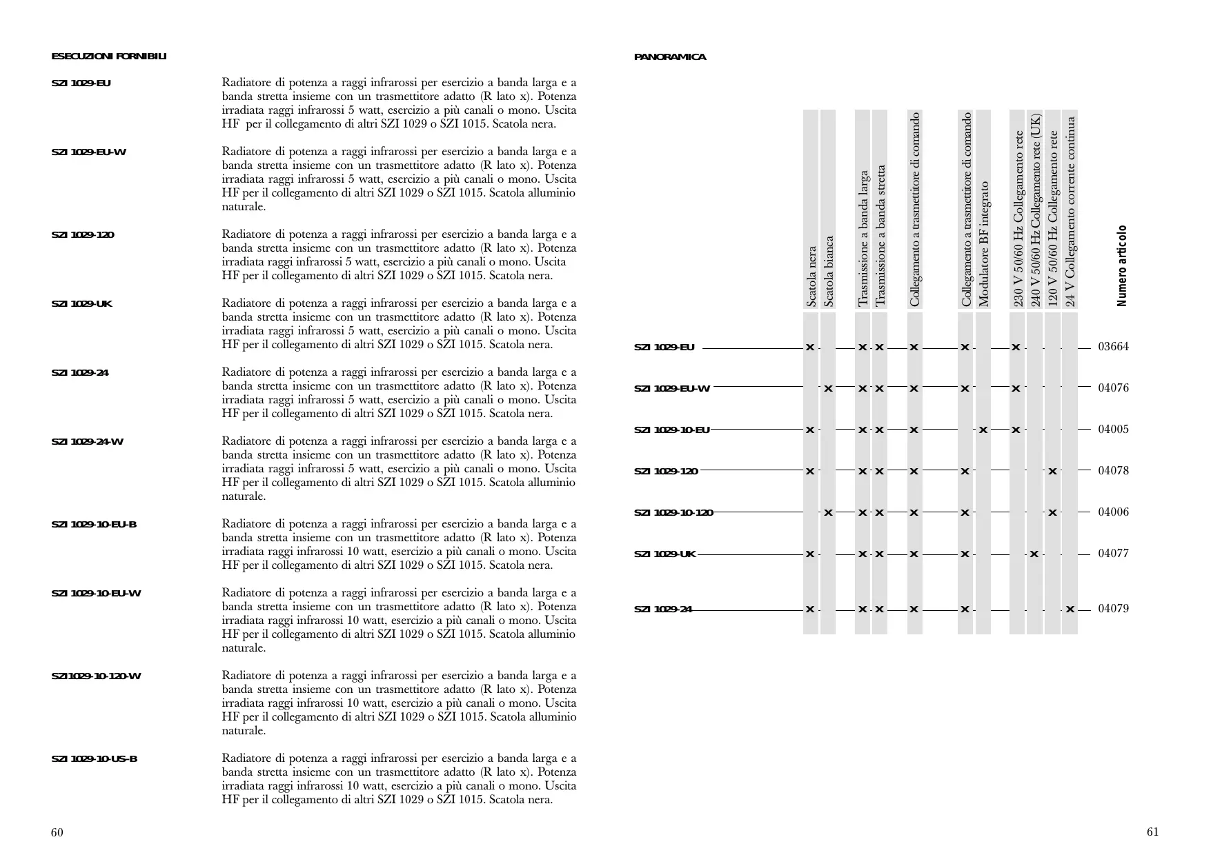 | SZI 1029-24 | Radiatore di potenza a raggi infrarossi per esercizio a banda larga e a banda stretta insieme con un tramettitore adatto (R lato x). Potenza irradiata raggi infrarossi 5 watt, esercizio a più canali o mono. Uscita HF per il collegamento di altri SZI 1029 o SZI 1015. Scatola.nera. |
