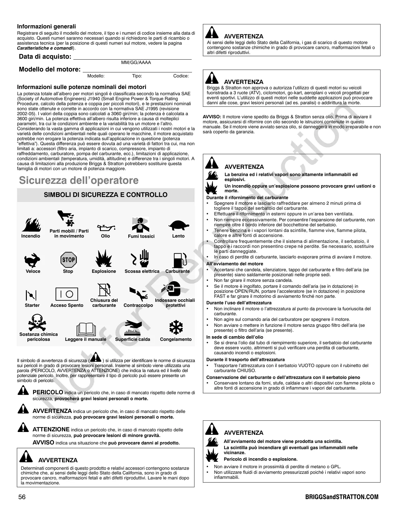 Codice: Informazioni sulle potenze nominali dei motori La potenza totale all’albero per motori singoli è classificata secondo la normativa SAE (Society of Automotive Engineers) J1940 (Small Engine Power & Torque Rating Procedure, calcolo della potenza e coppia per piccoli motori), e le prestazioni nominali sono state ottenute e corrette in accordo con la normativa SAE J1995 (revisione 2002-05). I valori della coppia sono calcolati a 3060 giri/min; la potenza è calcolata a 3600 giri/min. La potenza effettiva all’albero risulta inferiore a causa di molteplici parametri, tra cui le condizioni ambiente e la variabilità tra un motore e l’altro. Considerando la vasta gamma di applicazioni in cui vengono utilizzati i nostri motori e la varietà delle condizioni ambientali nelle quali operano le macchine, il motore acquistato potrebbe non erogare la potenza indicata sull’applicazione in questione (potenza “effettiva”). Questa differenza può essere dovuta ad una varietà di fattori tra cui, ma non limitati a: accessori (filtro aria, impianto di scarico, compressore, impianto di raffreddamento, carburatore, pompa del carburante, ecc.), limitazioni di applicazione, condizioni ambientali (temperatura, umidità, altitudine) e differenze tra i singoli motori. A causa di limitazioni alla produzione Briggs & Stratton potrebbero sostituire questa famiglia di motori con un motore di potenza maggiore. Sicurezza dell’operatore Parti mobili / Parti in movimento Olio Esplosione Starter Acceso Spento Chiusura del carburante Scossa elettrica Carburante