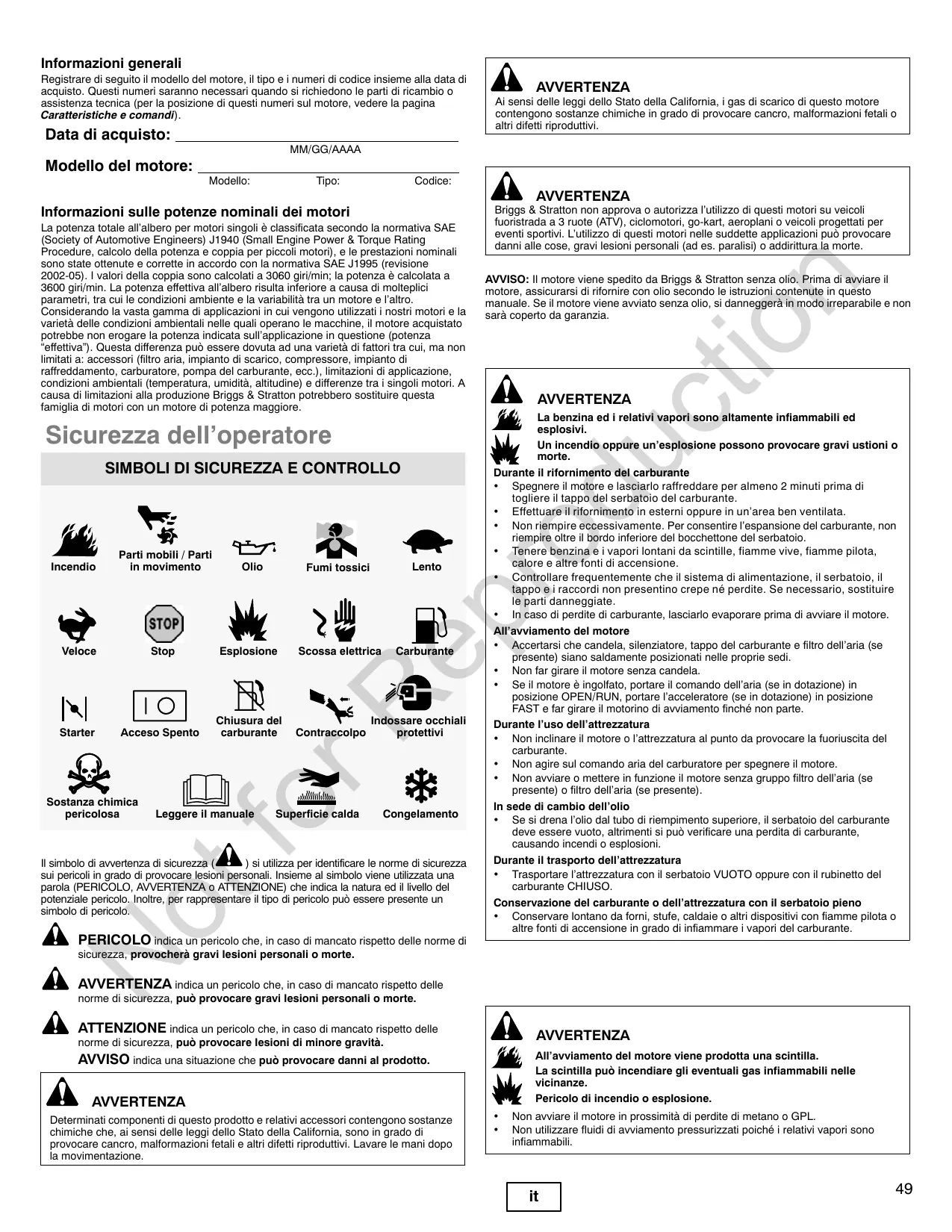 Codice: Informazioni sulle potenze nominali dei motori La potenza totale all’albero per motori singoli è classificata secondo la normativa SAE (Society of Automotive Engineers) J1940 (Small Engine Power & Torque Rating Procedure, calcolo della potenza e coppia per piccoli motori), e le prestazioni nominali sono state ottenute e corrette in accordo con la normativa SAE J1995 (revisione 2002-05). I valori della coppia sono calcolati a 3060 giri/min; la potenza è calcolata a 3600 giri/min. La potenza effettiva all’albero risulta inferiore a causa di molteplici parametri, tra cui le condizioni ambiente e la variabilità tra un motore e l’altro. Considerando la vasta gamma di applicazioni in cui vengono utilizzati i nostri motori e la varietà delle condizioni ambientali nelle quali operano le macchine, il motore acquistato potrebbe non erogare la potenza indicata sull’applicazione in questione (potenza “effettiva”). Questa differenza può essere dovuta ad una varietà di fattori tra cui, ma non limitati a: accessori (filtro aria, impianto di scarico, compressore, impianto di raffreddamento, carburatore, pompa del carburante, ecc.), limitazioni di applicazione, condizioni ambientali (temperatura, umidità, altitudine) e differenze tra i singoli motori. A causa di limitazioni alla produzione Briggs & Stratton potrebbero sostituire questa famiglia di motori con un motore di potenza maggiore. Sicurezza dell’operatore Parti mobili / Parti in movimento Olio Esplosione Starter Acceso Spento Chiusura del carburante Scossa elettrica Carburante