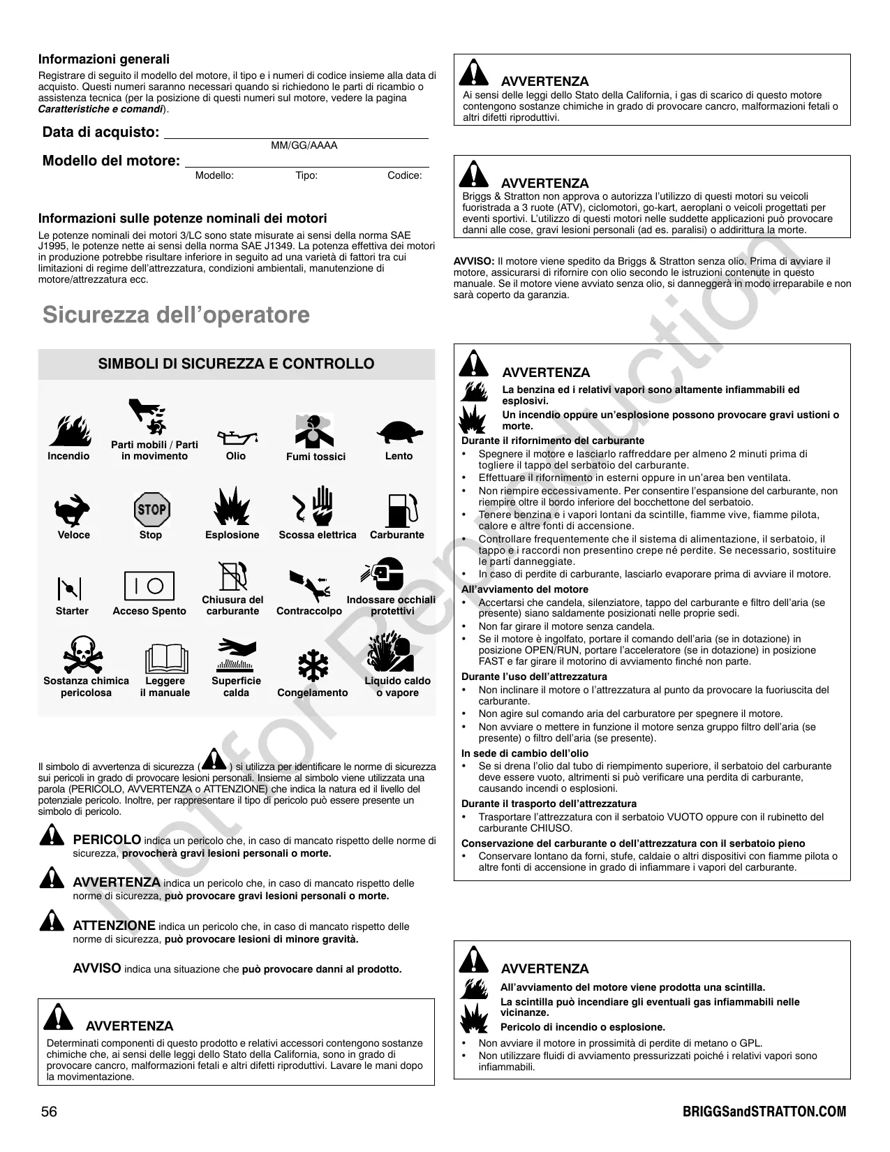 Modello: Tipo: Codice: Informazioni sulle potenze nominali dei motori Le potenze nominali dei motori 3/LC sono state misurate ai sensi della norma SAE J1995, le potenze nette ai sensi della norma SAE J1349. La potenza effettiva dei motori in produzione potrebbe risultare inferiore in seguito ad una varietà di fattori tra cui limitazioni di regime dell’attrezzatura, condizioni ambientali, manutenzione di motore/attrezzatura ecc. AVVISO: Il motore viene spedito da Briggs & Stratton senza olio. Prima di avviare il motore, assicurarsi di rifornire con olio secondo le istruzioni contenute in questo manuale. Se il motore viene avviato senza olio, si danneggerà in modo irreparabile e non sarà coperto da garanzia. tio Sicurezza dell’operatore AVVERTENZA Briggs & Stratton non approva o autorizza l’utilizzo di questi motori su veicoli fuoristrada a 3 ruote (ATV), ciclomotori, go-kart, aeroplani o veicoli progettati per eventi sportivi. L’utilizzo di questi motori nelle suddette applicazioni può provocare danni alle cose, gravi lesioni personali (ad es. paralisi) o addirittura la morte.