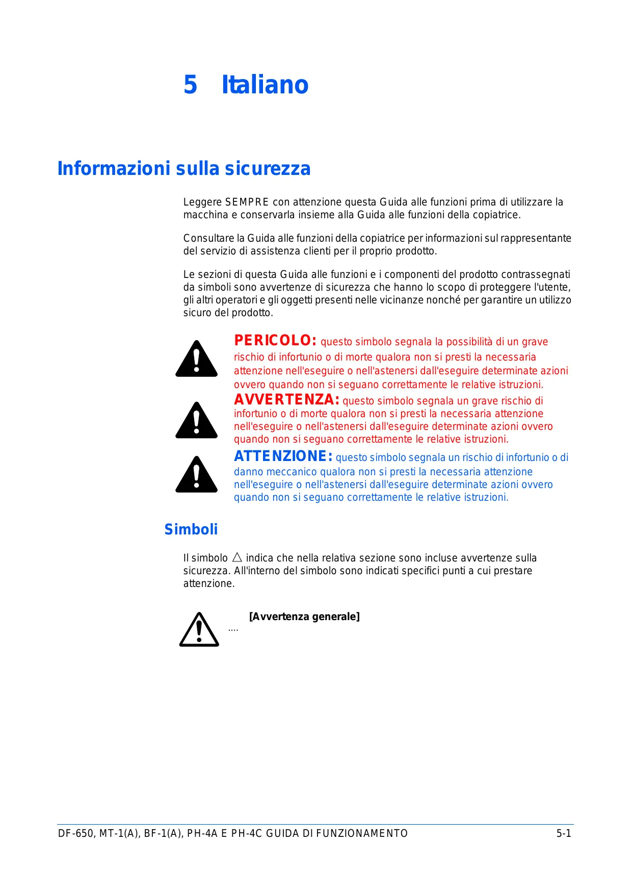 DF-650, MT-1(A), BF-1(A), PH-4A E PH-4C GUIDA DI FUNZIONAMENTO 5-1 Italiano Il simbolo indica che nella relativa sezione sono incluse informazioni sulle azioni vietate. All'interno del simbolo sono specificate le azioni vietate. [Azione vietata]