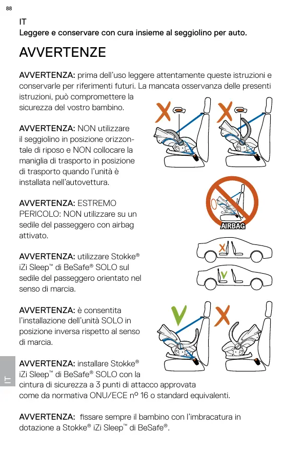 AVERTISSEMENT: installer UNIQUEMENT le Stokke® iZi Sleep™ de BeSafe® à l’aide d’une ceinture 3 points approuvée par la réglementation CEE/NU n° 16 ou par d’autres normes équivalentes.