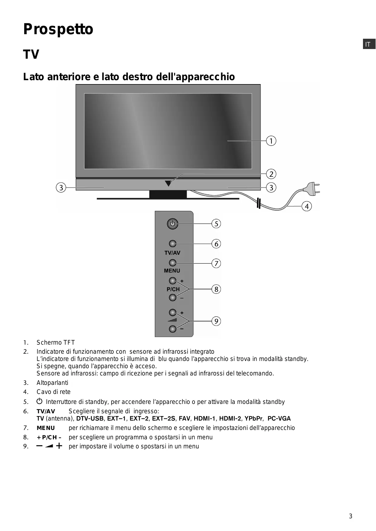 Lato anteriore e lato destro dell'apparecchio she Schermo TFT Indicatore di funzionamento con sensore ad infrarossi integrato L'indicatore di funzionamento si illumina di blu quando l'apparecchio si trova in modalità standby. Si spegne, quando l'apparecchio è acceso. Sensore ad infrarossi: campo di ricezione per i segnali ad infrarossi del telecomando. Altoparlanti Cavo direte © Interruttore di standby, per accendere l'apparecchio o per attivare la modalità standby TV/AV Scegliere il segnale di ingresso: TV (antenna), DTV-USB, EXT-1, EXT-2, EXT-2S, FAV, HDMI-1, HDMI-2, YPbPr, PC-VGA MENU per richiamare il menu dello schermo e scegliere le impostazioni dell'apparecchio +P/CH- per scegliere un programma o spostarsi in un menu — + perimpostare il volume o spostarsi in un menu