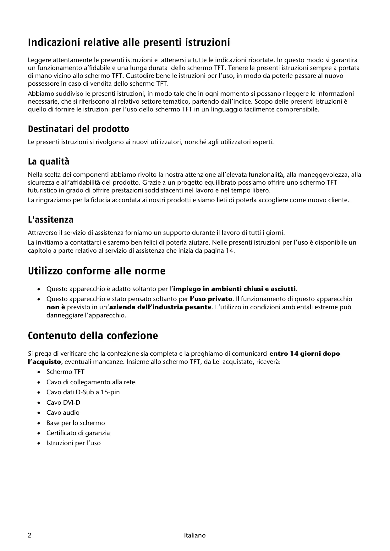 Contenuto della confezione Si prega di verificare che la confezione sia completa e la preghiamo di comunicarci entro 14 giorni dopo l’acquisto, eventuali mancanze. Insieme allo schermo TFT, da Lei acquistato, riceverà: Schermo TFT Cavo di collegamento alla rete Cavo dati D-Sub a 15-pin Cavo DVI-D Cavo audio Base per lo schermo Certificato di garanzia Istruzioni per l’uso