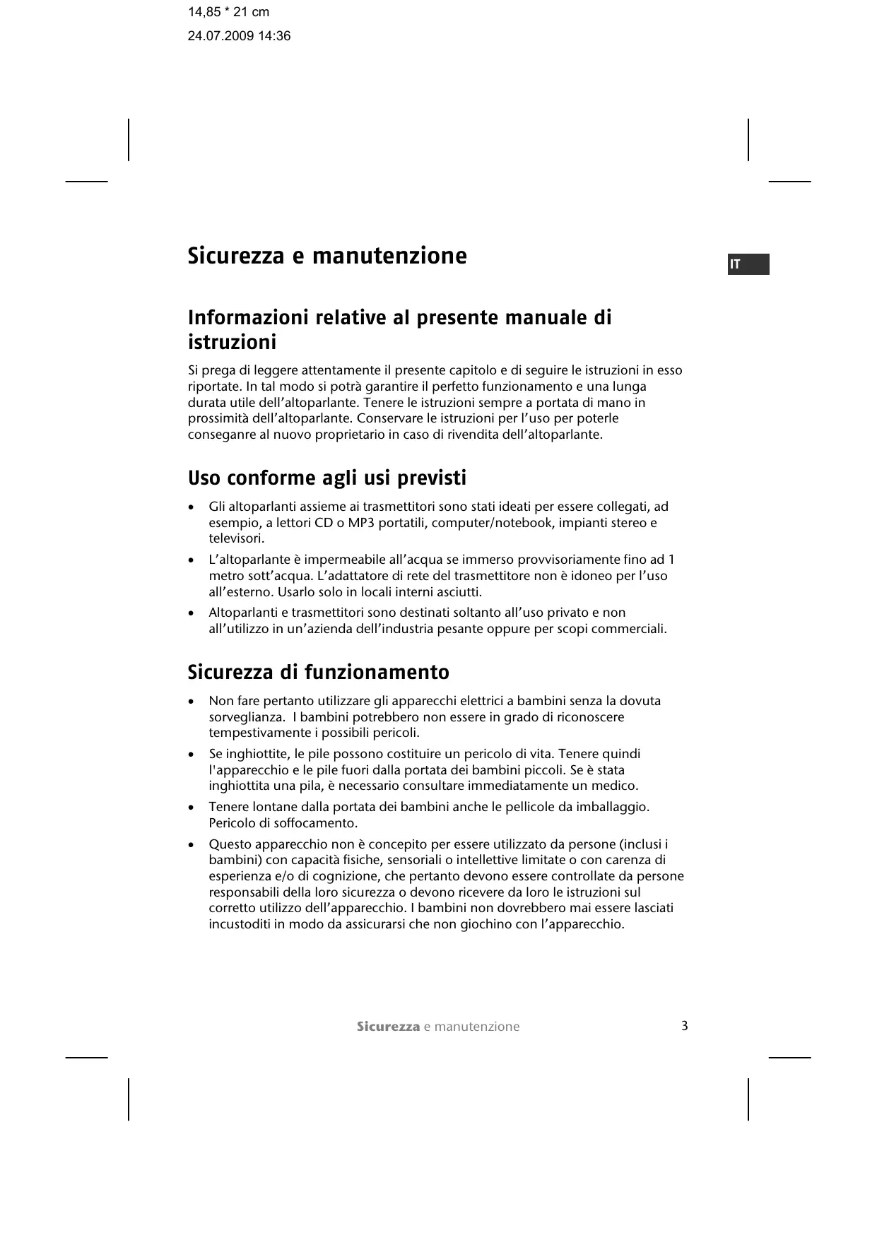Non aprire mai l'involucro dell'altoparlante, del trasmettitore o dell'alimentatore di rete, per evitare di corre che dei pericol! Se l'involucro dell'adattatore di rete è aperto si corre il rischio mortale di rimanere folgorati. Inesso non è containuta alcuna minuteria soggetta a manutenzione.