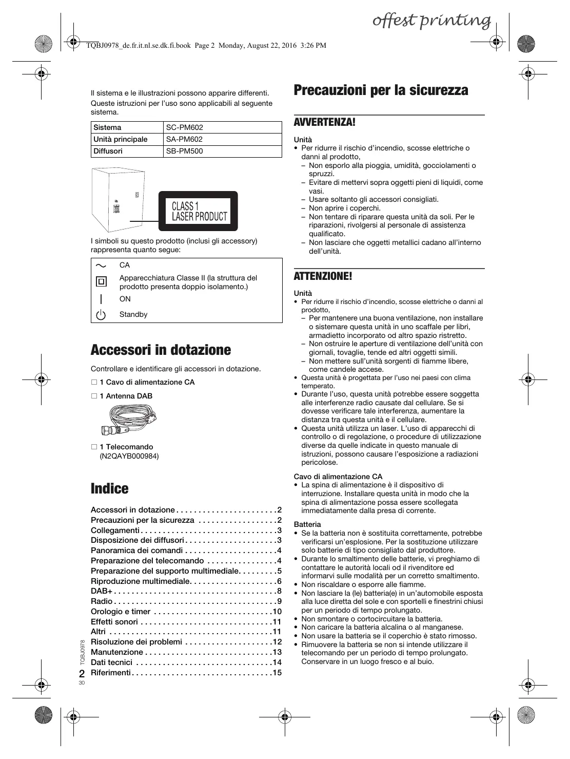 - Rimuovere la batteria se non si intende utilizzare il telecomando per un periodo di tempo prolungato. Conservare in un luogo fresco e al buio. offest printing TQBJ0978_de.fr.it.nl.se.dk.fi.book Page 3 Monday, August 22, 2016 3:26 PM