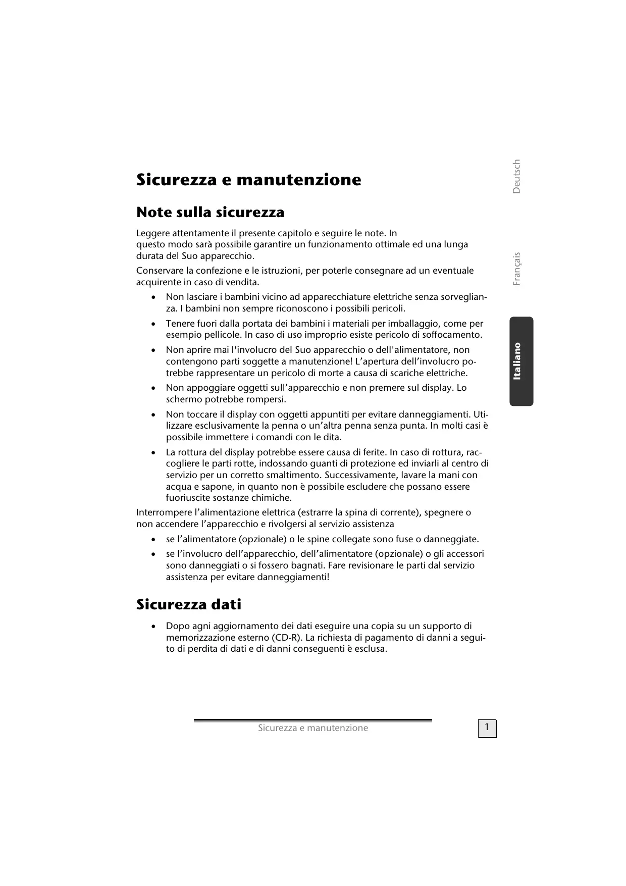 Scambio di dati 20 Schede di memoria 19 Servizio i Servizio assistenza 53 Sicurezza dati 1 Sicurezza d'esercizio Informazione sulla conformità R&TTE 4 Sicurezza e Manutenzione 1 Sincronizzazione con il PC 57 Slot SD/MMC 12 Smaltimento rifiuti 6 Sommario ii