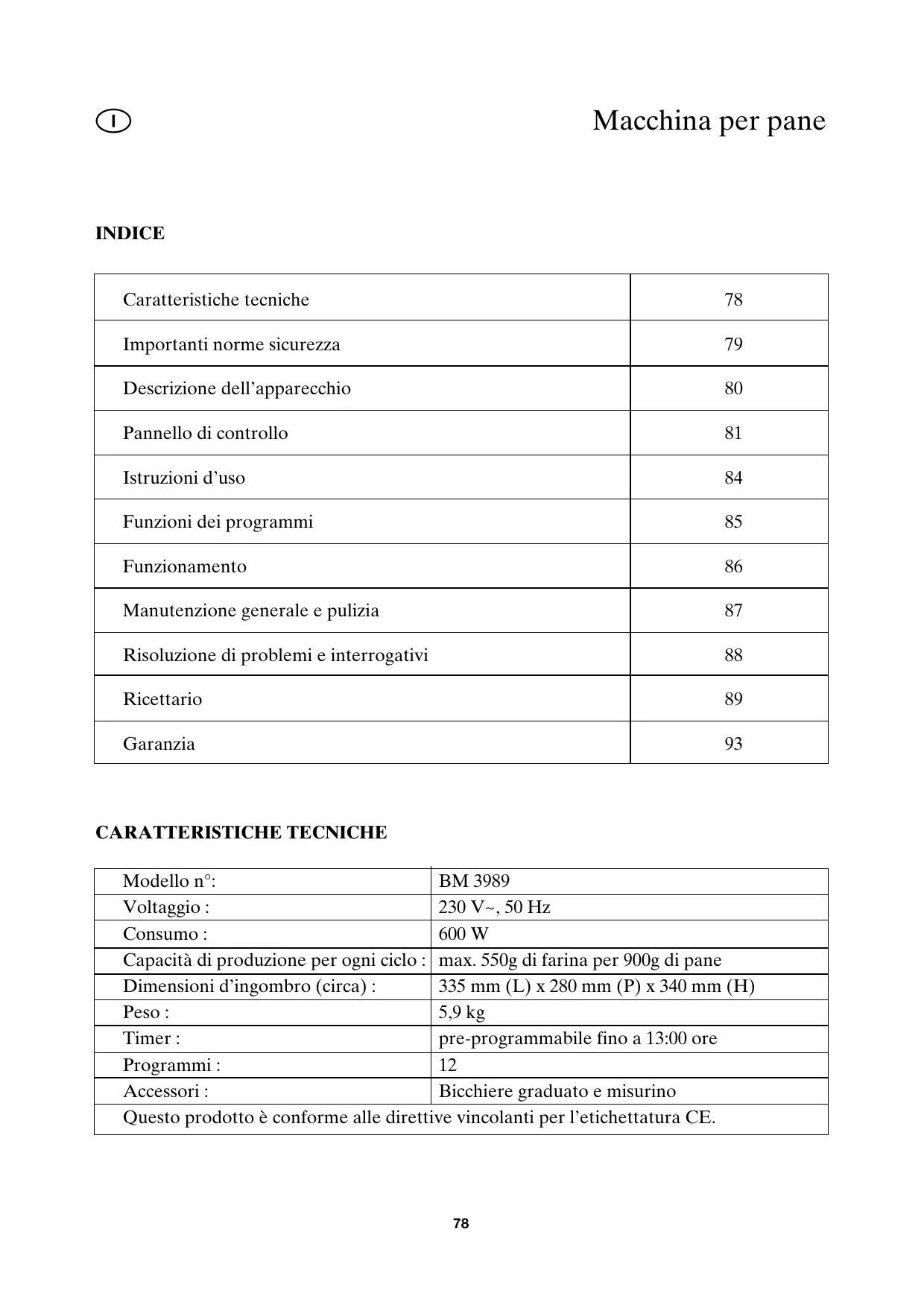 CARATTERISTICHE TECNICHE Modello n°: BM 3989 Voltaggio : 230 V~, 50 Hz Consumo : 600 W Capacità di produzione per ogni ciclo : max. 550g di farina per 900g di pane Dimensioni d’ingombro (circa) : 335 mm (L) x 280 mm (P) x 340 mm (H) Peso : 5,9 kg Timer : pre-programmabile fino a 13:00 ore Programmi : Accessori : Bicchiere graduato e misurino Questo prodotto è conforme alle direttive vincolanti per l’etichettatura CE.