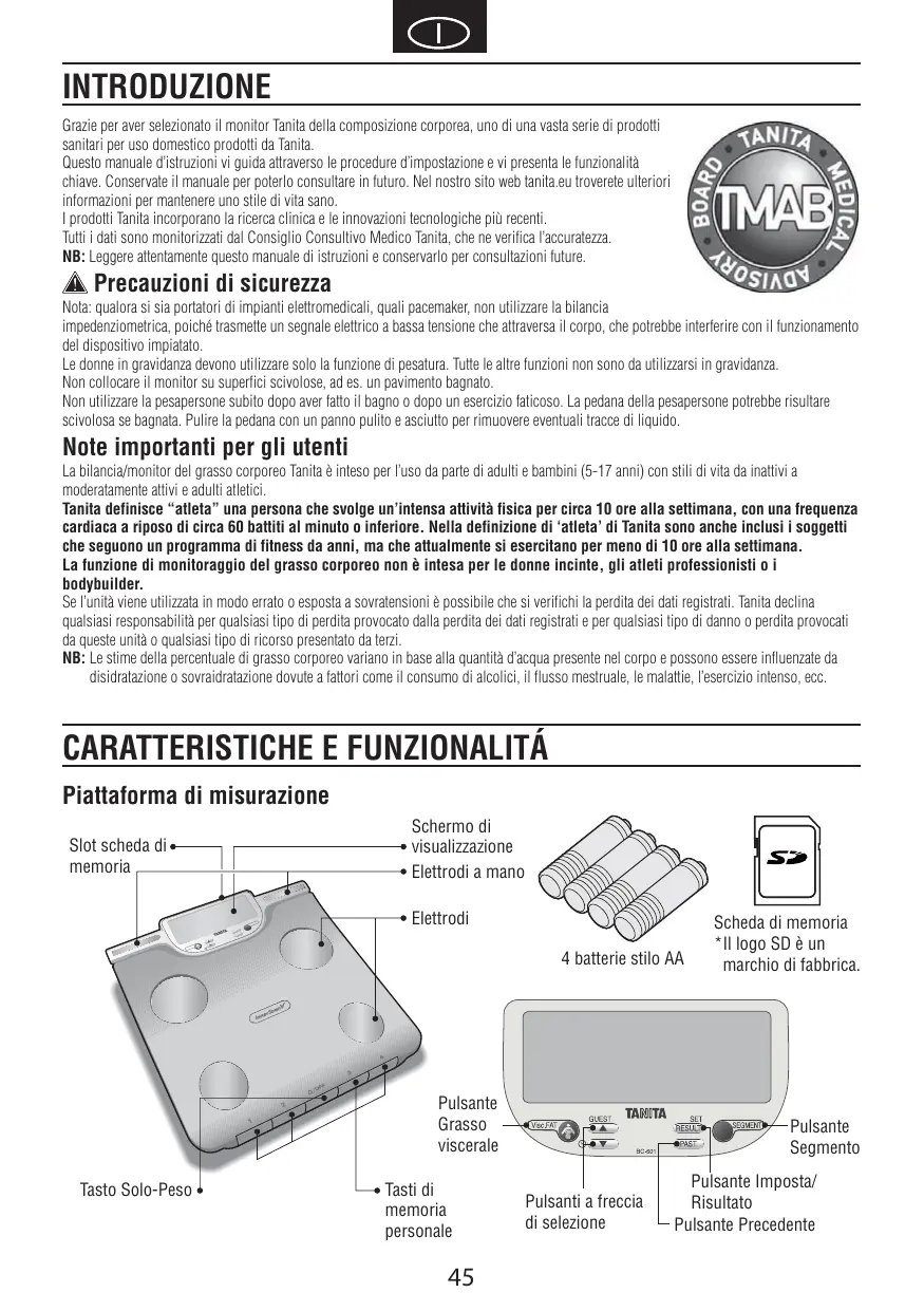 INTRODUZIONE Grazie per aver selezionato il monitor Tanita della composizione corporea, uno di una vasta serie di prodotti sanitari per uso domestico prodotti da Tanita. Questo manuale d’istruzioni vi guida attraverso le procedure d’impostazione e vi presenta le funzionalità chiave. Conservate il manuale per poterlo consultare in futuro. Nel nostro sito web tanita.eu troverete ulteriori informazioni per mantenere uno stile di vita sano. I prodotti Tanita incorporano la ricerca clinica e le innovazioni tecnologiche più recenti. Tutti i dati sono monitorizzati dal Consiglio Consultivo Medico Tanita, che ne verifica l’accuratezza. NB: Leggere attentamente questo manuale di istruzioni e conservarlo per consultazioni future. Precauzioni di sicurezza Nota: qualora si sia portatori di impianti elettromedicali, quali pacemaker, non utilizzare la bilancia impedenziometrica, poiché trasmette un segnale elettrico a bassa tensione che attraversa il corpo, che potrebbe interferire con il funzionamento del dispositivo impiatato. Le donne in gravidanza devono utilizzare solo la funzione di pesatura. Tutte le altre funzioni non sono da utilizzarsi in gravidanza. Non collocare il monitor su superfici scivolose, ad es. un pavimento bagnato. Non utilizzare la pesapersone subito dopo aver fatto il bagno o dopo un esercizio faticoso. La pedana della pesapersone potrebbe risultare scivolosa se bagnata. Pulire la pedana con un panno pulito e asciutto per rimuovere eventuali tracce di liquido. Note importanti per gli utenti La bilancia/monitor del grasso corporeo Tanita è inteso per l’uso da parte di adulti e bambini (5-17 anni) con stili di vita da inattivi a moderatamente attivi e adulti atletici. Tanita definisce “atleta” una persona che svolge un’intensa attività fisica per circa 10 ore alla settimana, con una frequenza cardiaca a riposo di circa 60 battiti al minuto o inferiore. Nella definizione di ‘atleta’ di Tanita sono anche inclusi i soggetti che seguono un programma di fitness da anni, ma che attualmente si esercitano per meno di 10 ore alla settimana. La funzione di monitoraggio del grasso corporeo non è intesa per le donne incinte, gli atleti professionisti o i bodybuilder. Se l’unità viene utilizzata in modo errato o esposta a sovratensioni è possibile che si verifichi la perdita dei dati registrati. Tanita declina qualsiasi responsabilità per qualsiasi tipo di perdita provocato dalla perdita dei dati registrati e per qualsiasi tipo di danno o perdita provocati da queste unità o qualsiasi tipo di ricorso presentato da terzi. NB: Le stime della percentuale di grasso corporeo variano in base alla quantità d’acqua presente nel corpo e possono essere influenzate da disidratazione o sovraidratazione dovute a fattori come il consumo di alcolici, il flusso mestruale, le malattie, l’esercizio intenso, ecc.