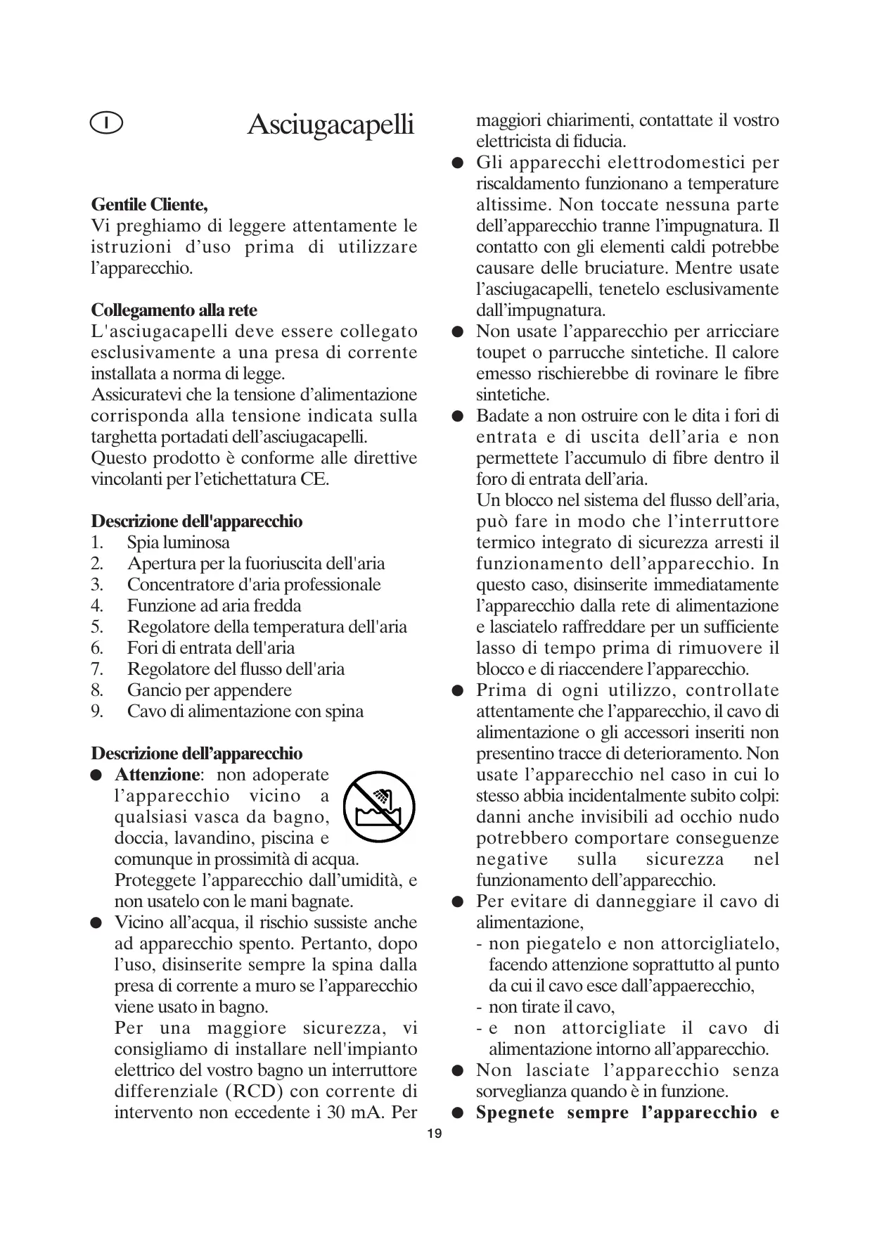Gentile Cliente, Vi preghiamo di leggere attentamente le istruzioni d’uso prima di utilizzare l’apparecchio. Collegamento alla rete L'asciugacapelli deve essere collegato esclusivamente a una presa di corrente installata a norma di legge. Assicuratevi che la tensione d’alimentazione corrisponda alla tensione indicata sulla targhetta portadati dell’asciugacapelli. Questo prodotto è conforme alle direttive vincolanti per l’etichettatura CE.