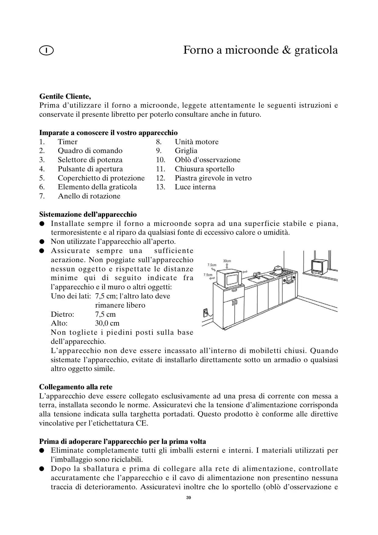 Mise en place de l’appareil ● Installez toujours le four à micro-ondes sur une surface stable et plane, résistante à la chaleur et à l’abri de toute source de chaleur ou d’humidité excessive. ● Abstenez-vous d’utiliser l’appareil en plein air. ● Une aération suffisante doit être constamment assurée. Ne placez aucun objet sur l’appareil et veillez à ce que les distances minimales suivantes soient respectées entre l’appareil et le mur ou tout autre objet: Un côté : 7.5 cm; sans obstruction de l'autre côté Arrière: 7.5 cm Hauteur: 30.0 cm Les pieds sous l’appareil ne doivent pas être enlevés. L’appareil ne doit pas être installé dans une armoire. Evitez aussi, au moment de mettre l’appareil en place, de l’installer immédiatement sous une armoire ou tout autre objet analogue. Connexion au secteur L’appareil doit être branché exclusivement sur une prise de courant avec terre, installée selon les normes. Assurez-vous que la tension d’alimentation correspond à la tension indiquée sur la plaque signalétique. Ce produit est conforme aux directives obligatoires inhérentes au marquage CE. Avant d’utiliser l’appareil ● Otez tout emballage externe et interne. Les matériaux d’emballage utilisés se prêtent au