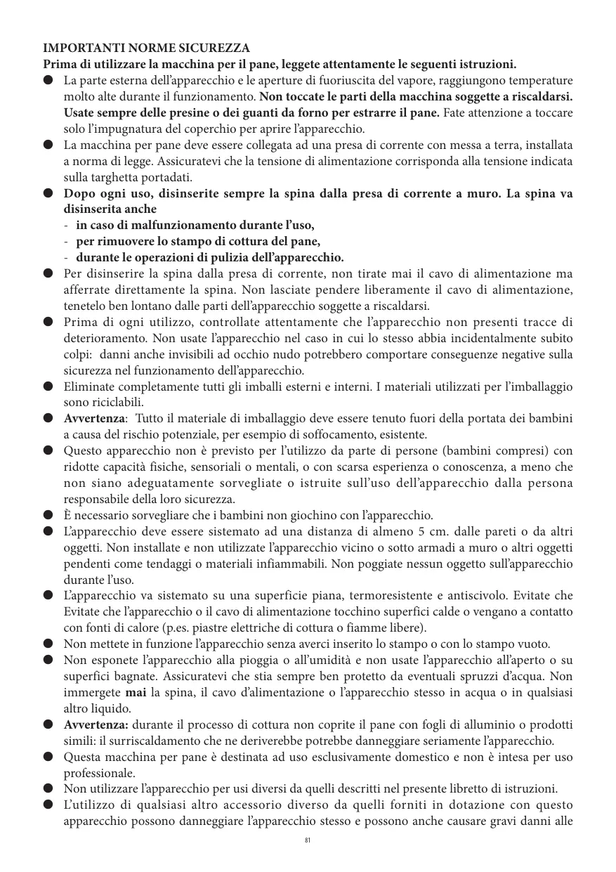 Prima di utilizzare la macchina per il pane, leggete attendamente le seguenti istruzioni.