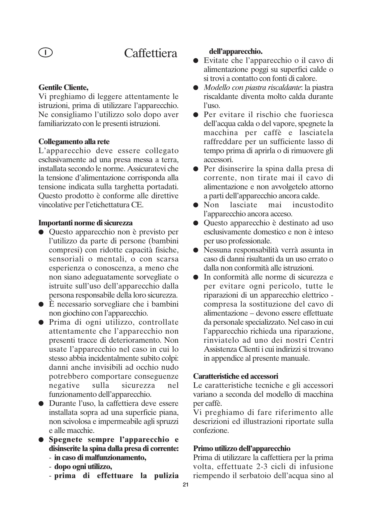 dell’apparecchio. Evitate che l’apparecchio o il cavo di alimentazione poggi su superfici calde o si trovi a contatto con fonti di calore. Modello con piastra riscaldante: la piastra riscaldante diventa molto calda durante l'uso. Per evitare il rischio che fuoriesca dell’acqua calda o del vapore, spegnete la macchina per caffè e lasciatela raffreddare per un sufficiente lasso di tempo prima di aprirla o di rimuovere gli accessori. Per disinserire la spina dalla presa di corrente, non tirate mai il cavo di alimentazione e non avvolgetelo attorno a parti dell’apparecchio ancora calde. Non lasciate mai incustodito l’apparecchio ancora acceso. Questo apparecchio è destinato ad uso esclusivamente domestico e non è inteso per uso professionale. Nessuna responsabilità verrà assunta in caso di danni risultanti da un uso errato o dalla non conformità alle istruzioni. In conformità alle norme di sicurezza e per evitare ogni pericolo, tutte le riparazioni di un apparecchio elettrico - compresa la sostituzione del cavo di alimentazione — devono essere effettuate da personale specializzato. Nel caso in cui l’apparecchio richieda una riparazione, rinviatelo ad uno dei nostri Centri Assistenza Clienti i cui indirizzi si trovano in appendice al presente manuale.