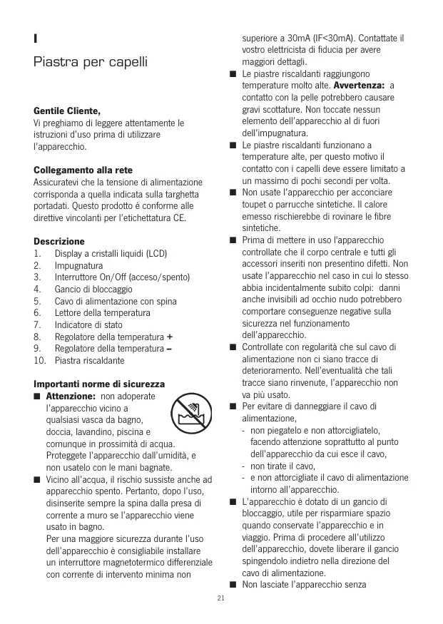 Importanti norme di sicurezza 1 Attenzione: non adoperate l'apparecchio vicino a qualsiasi vasca da bagno, doccia, lavandino, piscina e comunque in prossimità di acqua. Proteggete l'apparecchio dal! umidit, e non usatelo con le mani bagnate. Vicino all'acqua, il rischio sussiste anche ad apparecchio spento. Pertanto, dopo l'uso, disinserite sempre La spina dalla presa di corrente a muro se l'apparecchio viene usato in bagno. Per una maggiore sicurezza durante l'uso del'apparecchio à consiglabile installare un interruttore magnetotermico differenziale con corrente di intervento minima non superiore a 30mA (IF<30mA). Contattate il vostro elettrcista di iducia per avere maggiori dettagi. Le piastre riscaldanti raggiungono temperature molto alte. Avertenza: à contatto con la pelle potrebbero causare gravi scottature. Non toccate nessun elemento dell'apparecchio al di fuori del'impugnatura Le piastre riscaldanti funzionano a temperature alte, per questo motivo il contatto con i capell deve essere limitato a un massimo di pochi secondi per volt. Non usate l'apparecchio per acconciare oupet o parrucche sintetiche. II calore emesso rischierebbe di rovinare le fibre Sintetiche. Prima di mettere in uso l'apparecchio controllate che il corpo centrale e tutti gli accessori inserii non presentino difett. Non usate l'apparecchio nel caso in cui lo stesso abbia incidentalmente subito colpi: danni anche invisibili ad occhio nudo potrebbero comportare conseguenze negative sulla Sicurezza nel funzionamento dell apparecchio. Controllate con regolarità che sul cavo di alimentazione non ci siano tracce di deterioramento. Nelleventualità che tali tracce siano rinvenute, l'apparecchio non va più usato. Per euitare di danneggiare il cavo di alimentazione, -_ non piegatelo e non attorciglatelo, facendo attenzione soprattutto al punto dell'apparecchio da cui esce il cavo, = non tirate il cavo, -_e non attorciglate il cavo di alimentazione intoro all'apparecchio. L'apparecchio à dotato di un gancio di bloccaggio, utile per risparmiare spazio quando consenvate l'apparecchio ein viaggo. Prima di procedere all'utiizzo dell'apparecchio, dovete liberare il gancio spingendolo indietro nella direzione del cavo di alimentazione. Non lasciate l'apparecchio senza