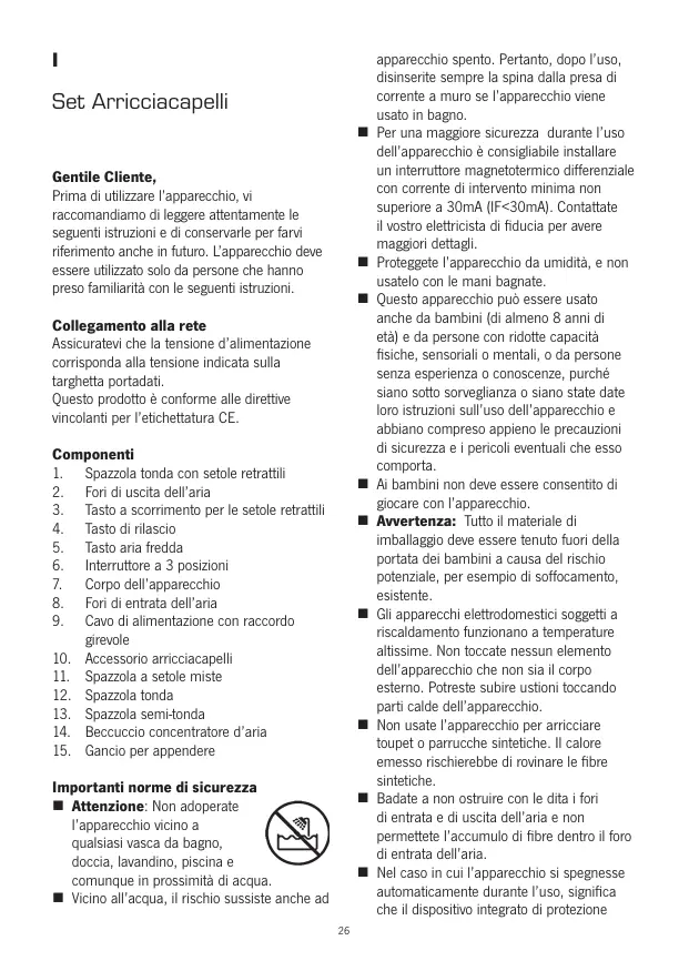 Importanti norme di sicurezza M Attenzione: Non adoperate l'apparecchio vicino à qualsiasi vasca da bagno, doccia, lavandino, piscina e comunque in prossimità di acqua. M Vicino all'acqua, il rischio sussiste anche ad apparecchio spento. Pertanto, dopo l'uso, disinserite sempre la spina dalla presa di corrente à muro se l'apparecchio viene usato in bagno. Per una maggiore sicurezza durante l'uso dell'apparecchio à consigliabile installare un interruttore magnetotermico differenziale con corrente di intervento minima non superiore a 30mA (IF<30mA). Contattate il vostro elettricista di fiducia per avere maggiori dettagl. Proteggete l'apparecchio da umidità, e non usatelo con le mani bagnate. Questo apparecchio puè essere usato anche da bambini (di almeno 8 anni di età) e da persone con ridotte capacitä fisiche, sensariali o mental o da persone senza esperienza 0 conoscenze, purché Siano sotto sorveglianza o siano state date loro istruzioni sull'uso dell'apparecchio & abbiano compreso appieno le precauzioni di sicurezza e i pericoli eventuali che esso comporta. Ai bambini non deve essere consentito di giocare con l'apparecchio. Awvertenza: Tutio il materiale di imballaggo deve essere tenuto fuori della portata dei bambini a causa del rischio potenziale, per esempio di soffocamento, esistente. Gli apparecchi elettrodomestici soggeti a riscaldamento funzionano a temperature alissime. Non toccate nessun elemento dell'apparecchio che non sia il corpo estemo. Potreste subire ustioni toccando parti calde dell'apparecchio. Non usate l'apparecchio per arricciare toupet o parrucche sintetiche. I calore emesso rischierebbe di rovinare le fibre Sintetiche. Badate a non ostruire con le dit i fori di entrata e di uscita dell'aria e non permette l'accumulo di fibre dentro i foro di entrata del'aria. NNel caso in cui l'apparecchio si spegnesse automaticamente durante l'uso, significa che il dispositivo integrato di protezione