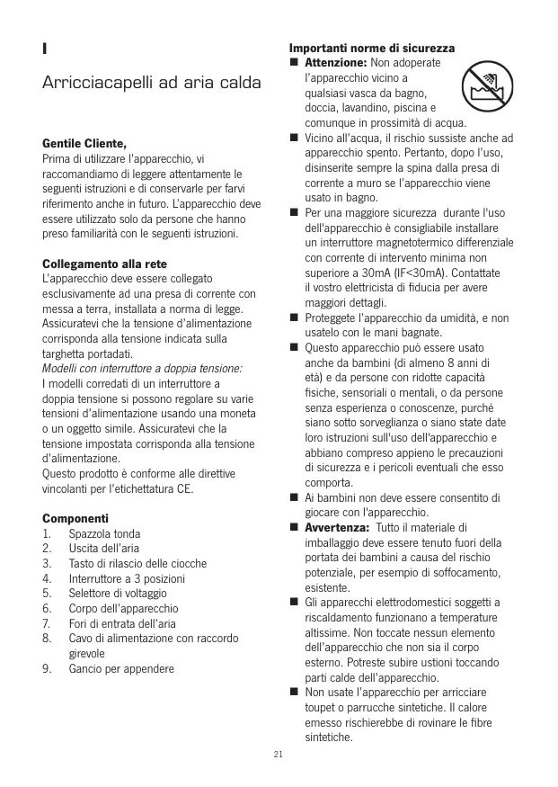 - Questo apparecchio può essere usato nde una bambini (di almeno 8 anni di età) e da personi con ridotte capacità fisiche, sensoriali o mentali, o da persona ricerca特殊情况 o conoscenze, purche siano sotto sorvegianza o siano state date loro struzioni sull'uso dell'apparechio e abbiano compreso appieno le precauzioni di sicurezza e i pericoli eventuali cheesso comporta.