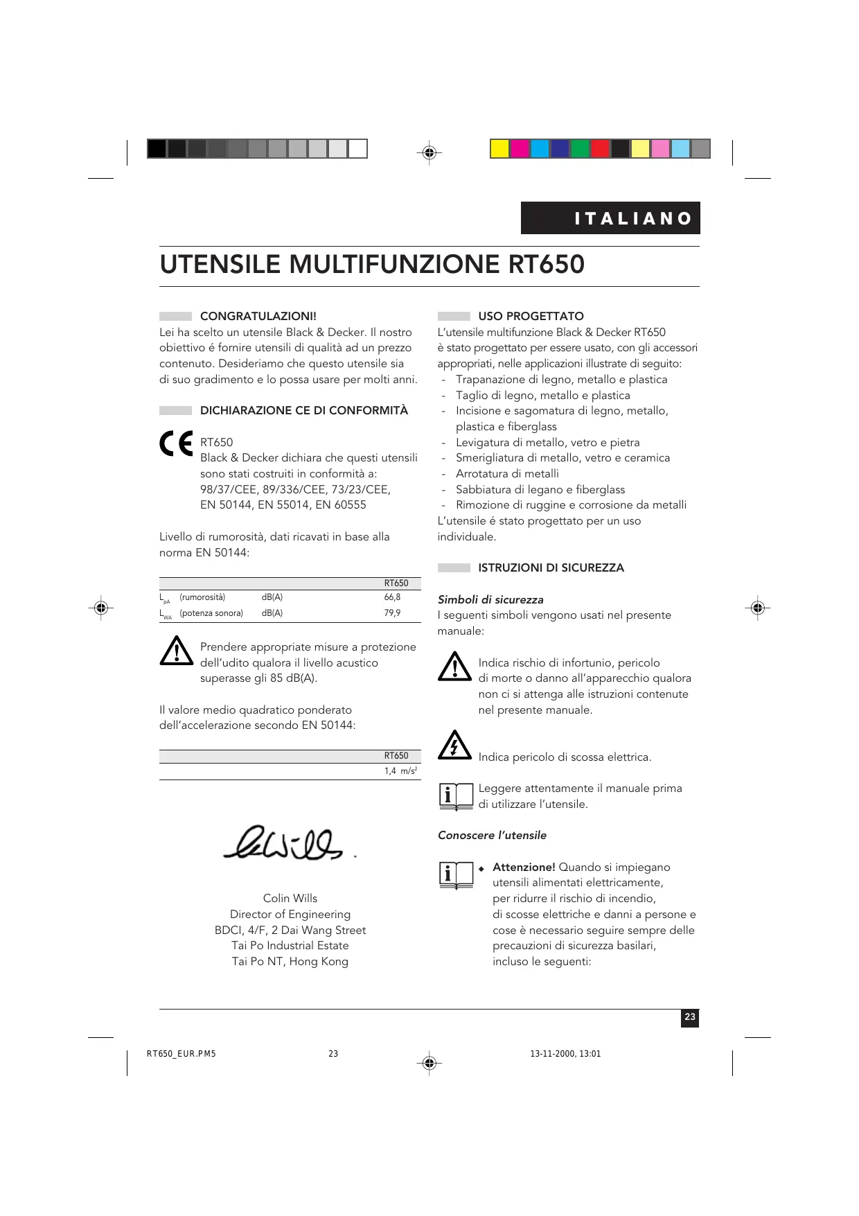 RT650 Black & Decker dichiara che questi utensili sono stati costruiti in conformità a: 98/37/CEE, 89/336/CEE, 73/23/CEE, EN 50144, EN 55014, EN 60555 Livello di rumorosità, dati ricavati in base alla norma EN 50144: USO PROGETTATO L’utensile multifunzione Black & Decker RT650 è stato progettato per essere usato, con gli accessori appropriati, nelle applicazioni illustrate di seguito: - Trapanazione di legno, metallo e plastica - Taglio di legno, metallo e plastica - Incisione e sagomatura di legno, metallo, plastica e fiberglass - Levigatura di metallo, vetro e pietra - Smerigliatura di metallo, vetro e ceramica - Arrotatura di metalli - Sabbiatura di legano e fiberglass - Rimozione di ruggine e corrosione da metalli L’utensile é stato progettato per un uso individuale.