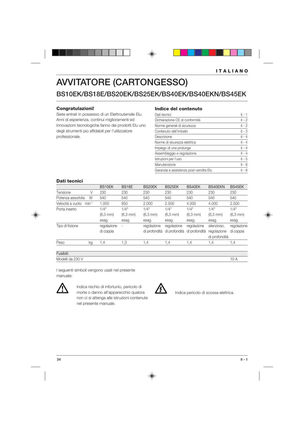 BS10EK/BS18E/BS20EK/BS25EK/BS40EK/BS40EKN/BS45EK Congratulazioni! Indice del contenuto