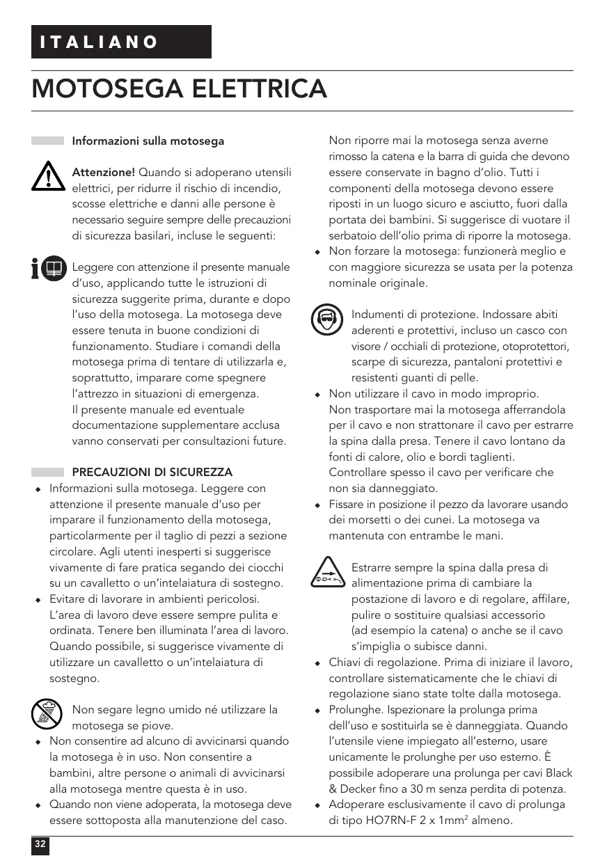 Non riporre mai la motosega senza averne rimosso la catena e la barra di guida che devono essere conservate in bagno d’olio. Tutti i componenti della motosega devono essere riposti in un luogo sicuro e asciutto, fuori dalla portata dei bambini. Si suggerisce di vuotare il serbatoio dell’olio prima di riporre la motosega. Non forzare la motosega: funzionerà meglio e con maggiore sicurezza se usata per la potenza nominale originale. Indumenti di protezione. Indossare abiti aderenti e protettivi, incluso un casco con visore / occhiali di protezione, otoprotettori, scarpe di sicurezza, pantaloni protettivi e resistenti guanti di pelle. Non utilizzare il cavo in modo improprio. Non trasportare mai la motosega afferrandola per il cavo e non strattonare il cavo per estrarre la spina dalla presa. Tenere il cavo lontano da fonti di calore, olio e bordi taglienti. Controllare spesso il cavo per verificare che non sia danneggiato. Fissare in posizione il pezzo da lavorare usando dei morsetti o dei cunei. La motosega va mantenuta con entrambe le mani. Estrarre sempre la spina dalla presa di alimentazione prima di cambiare la postazione di lavoro e di regolare, affilare, pulire o sostituire qualsiasi accessorio (ad esempio la catena) o anche se il cavo s’impiglia o subisce danni. Chiavi di regolazione. Prima di iniziare il lavoro, controllare sistematicamente che le chiavi di regolazione siano state tolte dalla motosega. Prolunghe. Ispezionare la prolunga prima dell’uso e sostituirla se è danneggiata. Quando l’utensile viene impiegato all’esterno, usare unicamente le prolunghe per uso esterno. È possibile adoperare una prolunga per cavi Black & Decker fino a 30 m senza perdita di potenza. Adoperare esclusivamente il cavo di prolunga di tipo HO7RN-F 2 x 1mm2 almeno. I TI A N