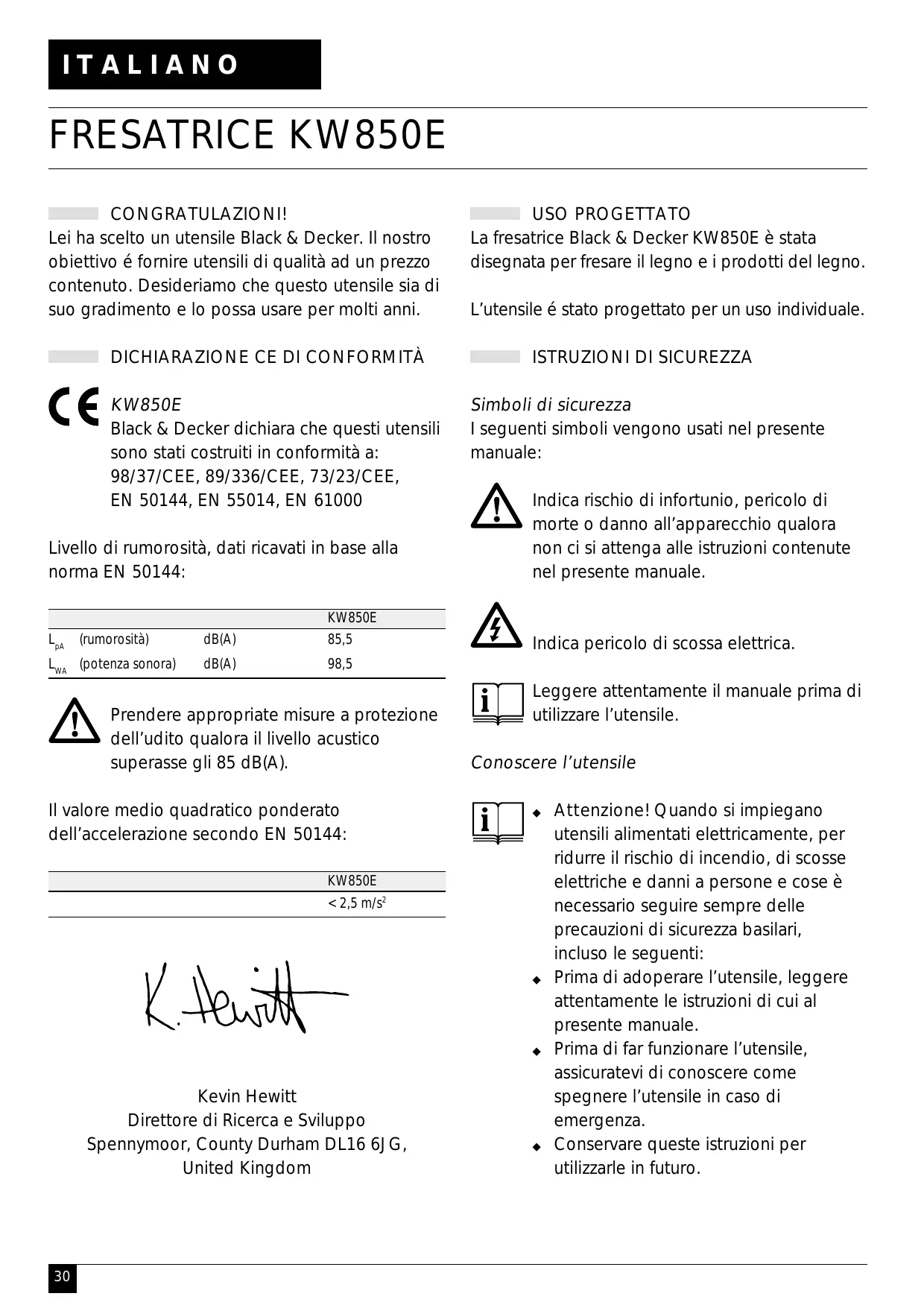 Black & Decker dichiara che questi utensili sono stati costrui in conformità a: 98/37/CEE, 89/336/CEE, 73/23/CEE, EN 50144, EN 55014, EN 61000