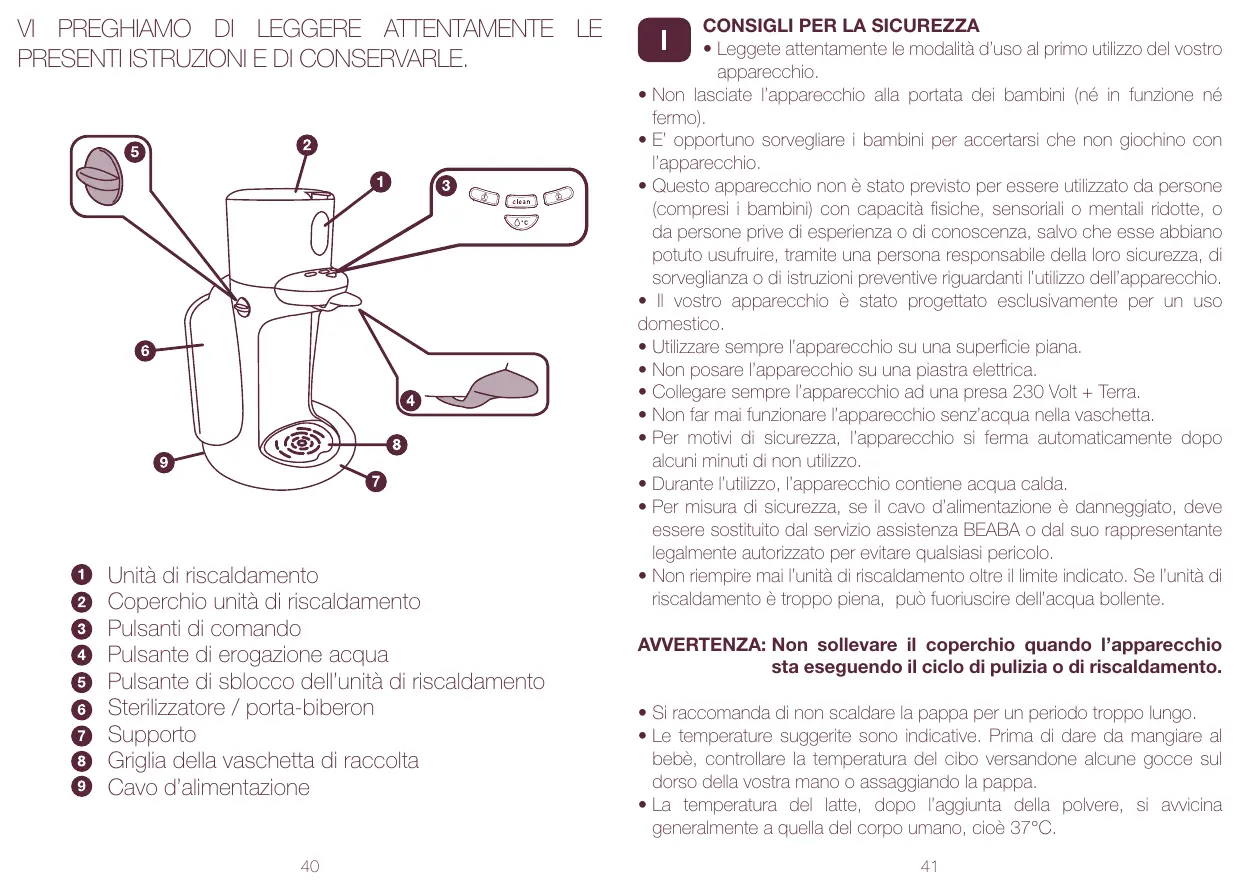 • Cet appareil n’est pas prévu pour être utilisé par des personnes (y compris les enfants) dont les capacités physiques, sensorielles ou mentales sont réduites, ou des personnes dénuées d’expérience ou de connaissance, sauf si elles ont pu bénéficier, par l’intermédiaire d’une personne responsable de leur sécurité, d’une surveillance ou d’instructions préalables concernant l’utilisation de l’appareil. • Votre appareil est conçu pour un usage exclusivement domestique. • Toujours utiliser l’appareil sur une surface plane. • Ne pas poser l’appareil sur une plaque électrique. • Toujours brancher l’appareil sur une prise 230 Volts + Terre. • Ne jamais faire fonctionner l’appareil sans eau dans la cuve. • Pour des raisons de sécurité, l’appareil s’arrête automatiquement après quelques minutes sans utilisation. • Par mesure de sécurité, si le câble d’alimentation est endommagé, il doit être remplacé par le service après-vente de Beaba ou de son représentant légal afin d’éviter un danger. • En utilisation, l’appareil contient de l’eau chaude. • Ne jamais remplir l’unité de chauffe au-delà de la limite indiquée. Si l’unité de chauffe est trop remplie, de l’eau bouillante peut être éjectée. MISE EN GARDE : Ne pas soulever le couvercle lorsque le produit est en cycle de nettoyage ou de chauffage. • Il est recommandé de ne pas chauffer la nourriture pendant une période trop longue. • Les températures indiquées sont indicatives. Avant de donner à manger à bébé, vérifier la température de l’aliment en versant quelques gouttes sur le dos de votre main ou en gouttant la nourriture. • La température du lait, après ajout de la poudre, avoisine généralement celle du corps humain, soit 37°C. 3