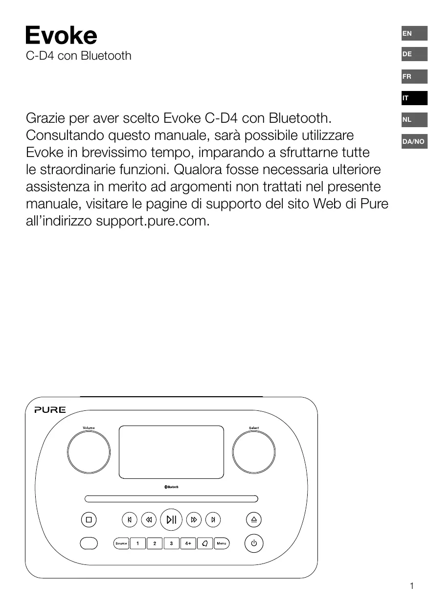 Grazie per aver scelto Evoke C-D4 con Bluetooth. Consultando questo manuale, sarà possibile utilizzare Evoke in brevissimo tempo, imparando a sfruttarne tutte le straordinarie funzioni. Qualora fosse necessaria ulteriore assistenza in merito ad argomenti non trattati nel presente manuale, visitare le pagine di supporto del sito Web di Pure all’indirizzo support.pure.com.