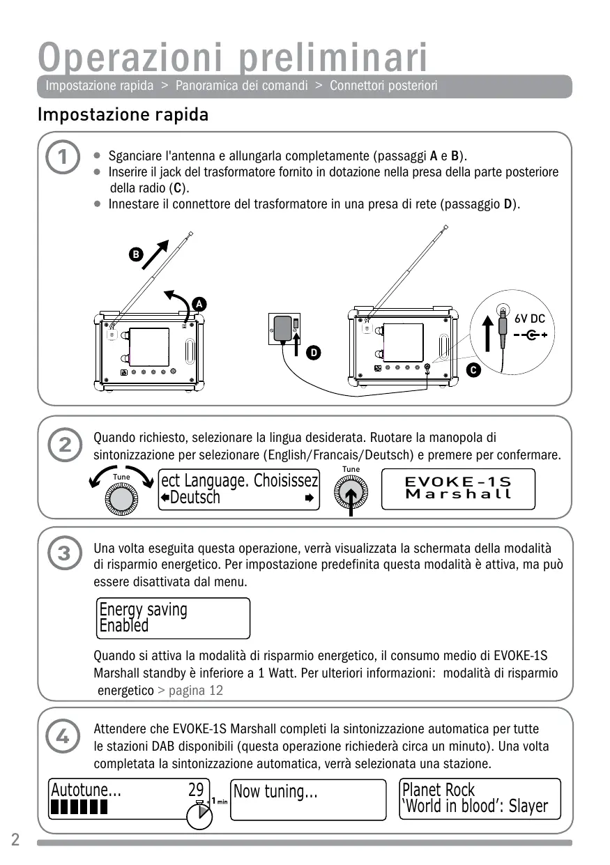 Marshall Una volta eseguita questa operazione, verrà visualizzata la schermata della modalità di risparmio energetico. Per impostazione predefinita questa modalità è attiva, ma può essere disattivata dal menu. Energy saving Enabled Quando si attiva la modalità di risparmio energetico, il consumo medio di EVOKE-1S Marshall standby è inferiore a 1 Watt. Per ulteriori informazioni: modalità di risparmio energetico > pagina 12 Attendere che EVOKE-1S Marshall completi la sintonizzazione automatica per tutte le stazioni DAB disponibili (questa operazione richiederà circa un minuto). Una volta completata la sintonizzazione automatica, verrà selezionata una stazione. Autotune...