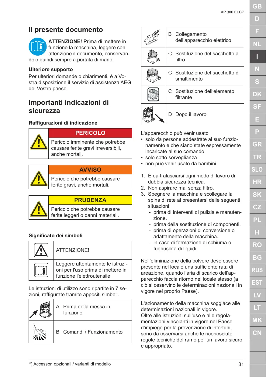 *) Speciaal toebehoren / verschillende uitvoeringen van de stofzuiger AP 300 ELCP Il presente documento ATTENZIONE! Prima di mettere in funzione la macchina, leggere con attenzione il documento, conservandolo quindi sempre a portata di mano. Ulteriore supporto Per ulteriori domande o chiarimenti, è a Vostra disposizione il servizio di assistenza AEG del Vostro paese. Importanti indicazioni di sicurezza Pericolo imminente che potrebbe causare ferite gravi irreversibili, anche mortali. AVVISO Pericolo che potrebbe causare ferite gravi, anche mortali. PRUDENZA Pericolo che potrebbe causare ferite leggeri o danni materiali. Significato dei simboli ATTENZIONE! Leggere attentamente le istruzioni per l'uso prima di mettere in funzione l'elettroutensile. Le istruzioni di utilizzo sono ripartite in 7 sezioni, raffigurate tramite appositi simboli. A Prima della messa in funzione B Comandi / Funzionamento *) Accessori opzionali / varianti di modello