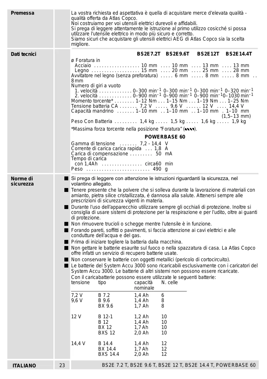 - BS2E 7.2 T, BS2E 9.6 T, BS2E 12 T, BS2E 14.4 T, POWERBASE 60 Premessa La vostra richiesta ed aspettativa è quella di acquistare merce d’elevata qualità qualità offerta da Atlas Copco. Noi costruiamo per voi utensili elettrici durevoli e affidabili. Si prega di leggere attentamente le istruzione al primo utilizzo cosicché si possa utilzzare l’utensile elettrico in modo più sicuro e corretto. Siamo sicuri che acquistare gli utensili elettrici AEG di Atlas Copco sia la scelta migliore. Dati tecnici BS2E7.2T BS2E9.6T BS2E12T BS2E14.4T ø Foratura in Acciaio p. 10
